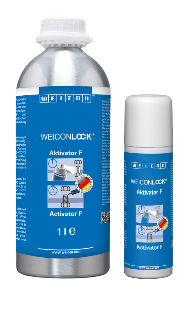 Met WEICON Aktivator F kan de uithardingstijd sterk worden verkort. De activator wordt ook geadviseerd bij alle passieve oppervlakken, evenals in elk geval bij lage omgevingstemperaturen (< +10 °C/+50 °F en daaronder) en grote naadbreedtes. Bij niet-metalen oppervlakken zorgt de activator pas voor uitharding van WEICONLOCK.