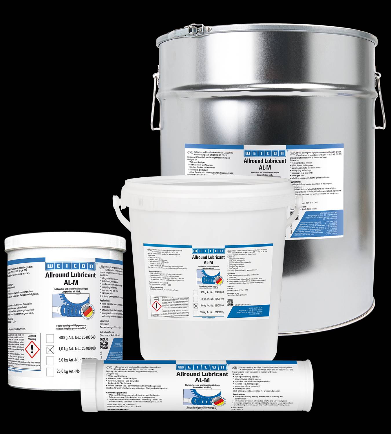 WEICON AL-M vermindert langdurig wrijving en slijtage en is geschikt voor wals- en glijlagers, scharnieren, hendels en lagers, voor spindels, nokken- en getande assen, veren, open aandrijvingen, wormwieloverbrengingen en bij alle voor vetsmering toegelaten glijsnelheden.