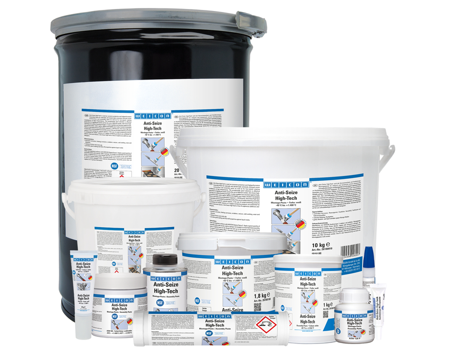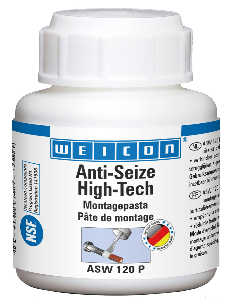 WEICON Anti-Seize High Tech heeft een hoge temperatuursbestendigheid en een buitengewoon goede lossende werking, is vrij van metalen, materiaalneutraal en NSF goedkeuring. WEICON Anti-Seize High-Tech is bijzonder geschikt wanneer metaalhoudende pasta’s elektrolytische reacties kunnen veroorzaken, nikkelhoudende producten niet gebruikt kunnen of mogen worden wegens gezondheidsredenen en donkere, metaalhoudende producten niet gebruikt kunnen of mogen worden wegens optische redenen.