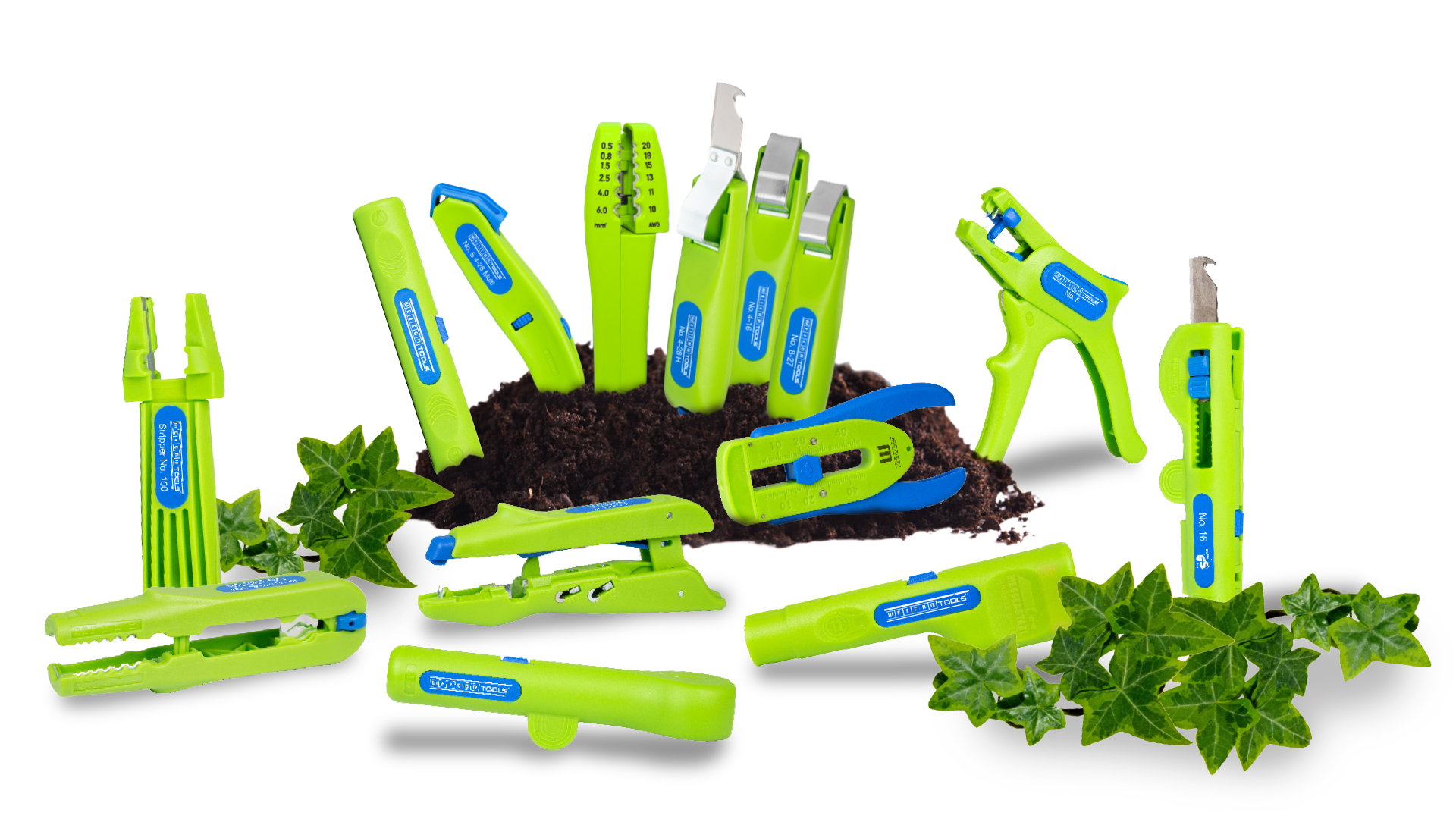 De WEICON TOOLS Green Line – 's werelds eerste afbijtgereedschap gemaakt van tot 97 procent hernieuwbare en recyclebare grondstoffen. De Green Line bestaat in totaal uit veertien verschillende gereedschappen – van kabelmessen en draadstrippers tot strippers en multifunctionele draadstrippers.