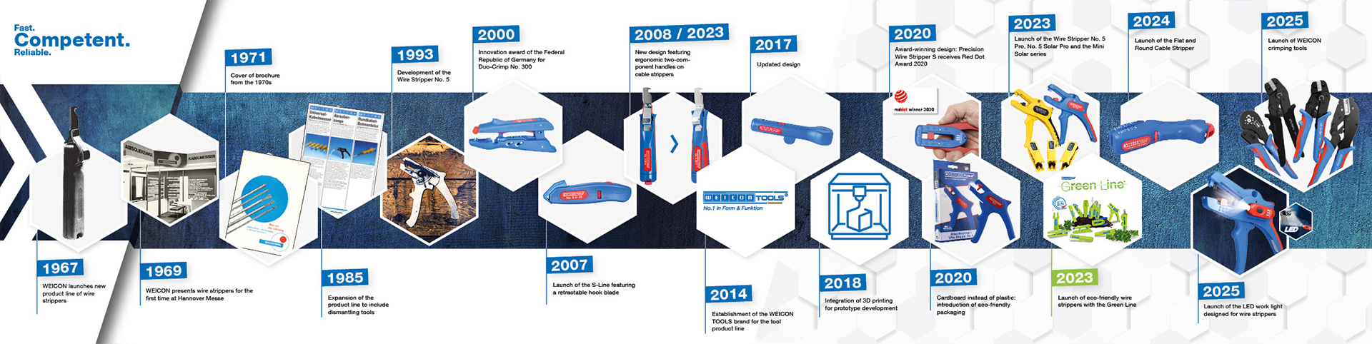 Reeds sinds 1967 ontwikkelen, produceren en verkopen wij Verwijderwerktuigen van hoge kwaliteit. Wij bieden een breed assortiment aan draadstrippers, kabelstrippers, krimptangen, multifunctionele draadstrippers, gereedschap voor de zonne-energie-industrie, speciaal gereedschap, sets en stripgereedschap gemaakt van tot wel 97% hernieuwbare grondstoffen. We presenteren deze tools elk jaar op meer dan 40 handelsbeurzen over de hele wereld. Tijdens deze evenementen is er een directe uitwisseling met gebruikers die ons vertellen over innovaties in hun werkprocessen en zo suggesties en verzoeken doen voor nieuwe of verbeterde WEICON TOOLS.