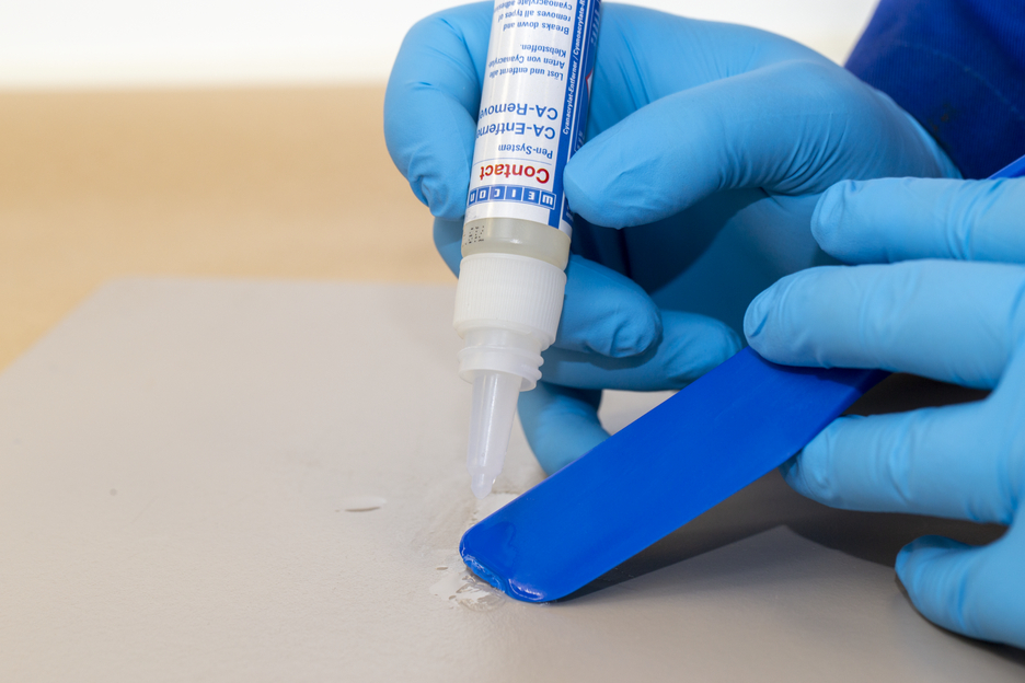WEICON CA-Remover reliably breaks down and removes all types of cyanoacrylate adhesives. The remover is suitable for cleaning metal parts, tools and many different surfaces that have come into contact with cyanoacrylate adhesives. After a few minutes of soaking in, the dissolved adhesive can be wiped off with a lint-free cloth. In case of stubborn soiling, repeat the procedure. Some plastics, coatings and sensitive surfaces may possibly be damaged by the CA-Remover. Therefore, the material compatibility of the surface should always be tested on a hidden area first. In contrast to other conventional solvents, WEICON CA-Remover is not highly flammable and has a high flash point of >120 °C.