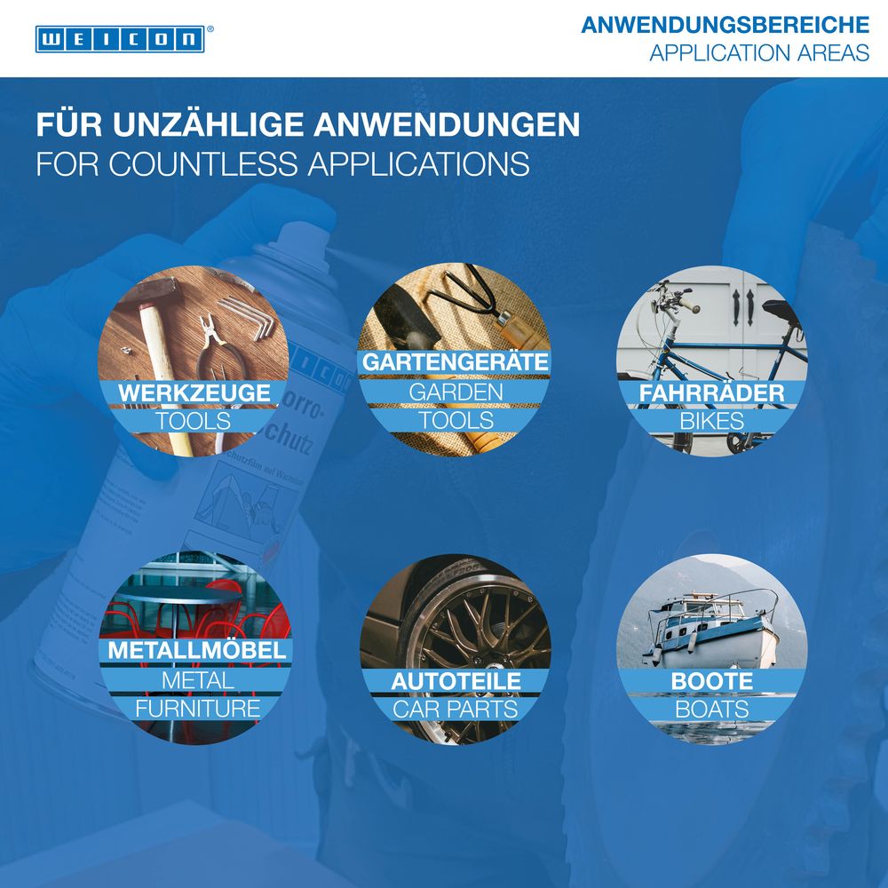WEICON Corro-Protection is een TÜV-geteste beschermfolie en conserveert metalen gereedschappen en precisieonderdelen permanent met een droge en wasachtige coating. WEICON Corro-Protection kan worden gebruikt als veilige corrosiebescherming voor kale, ongelakte metalen onderdelen, voor de interne opslag van werkstukken, als corrosiebescherming voor verzending overzee en voor de conservering van gereedschappen en precisieonderdelen. Indien nodig kan de beschermlaag eenvoudig worden verwijderd (bijv. met WEICON Cleaner S).