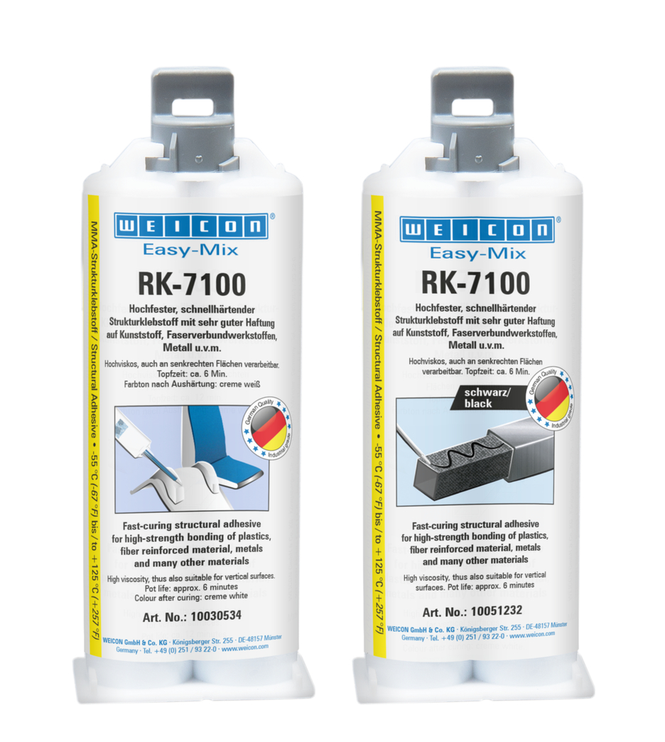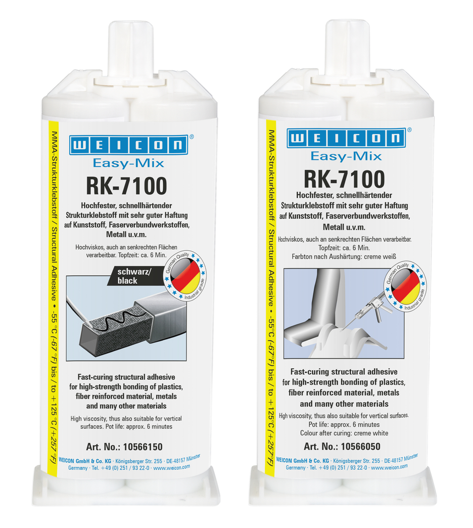 De acrylaat structurele lijm WEICON RK-7100 verbindt vele materialen, zoals kunststoffen, metalen of keramiek, aan en met elkaar met een hoge trek-, afschuif- en afpelsterkte. De lijm is bijzonder geschikt voor structurele verlijmingen waarbij verbindingen met hoge sterkte vereist zijn. De lijm is zeer viskeus en daarom ook geschikt voor gebruik op verticale oppervlakken. RK-7100 is universeel toepasbaar en kan bijvoorbeeld worden gebruikt in de kunststoftechnologie, metaalbouw, carrosserie- en voertuigbouw, machinebouw, elektrotechniek, model- en matrijzenbouw of in de beurs- en tentoonstellingsbouw. Het Easy-Mix D 50 doseerpistool is nodig voor het verwerken van Easy-Mix producten in 50 ml verpakkingen.