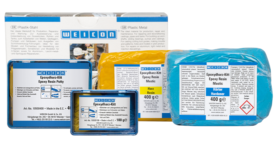WEICON Epoxyharskit is pasteus (kneedbaar), mineraalgevuld en temperatuursbestendig tot +200 °C (+392 °F). Het wordt verwerkt in een 1:1-mengverhouding en is na uitharding mechanisch te bewerken en overschilderbaar. Het hecht op metaal, hout, glas, rubber, keramiek, beton, de meeste kunststoffen en is bestand tegen benzine, olie, esters, zoutwater en de meeste zuren en logen. Het product is geschikt voor het afdichten van tanks en pijpen, het bevestigen van schroefen en haken, voor het herstellen en repareren van gietdelen, het opwerken en repareren van assen, lagers, pompen en behuizingen, het vernieuwen van beschadigde schroefdraden, het produceren van sjablonen en modellen en voor reparaties aan aluminium, lichtmetalen en spuitgiet-onderdelen. WEICON Epoxyharskit kan in de machinebouw, gereedschapsbouw, model- en matrijzenbouw en in vele andere industriële gebieden worden toegepast.