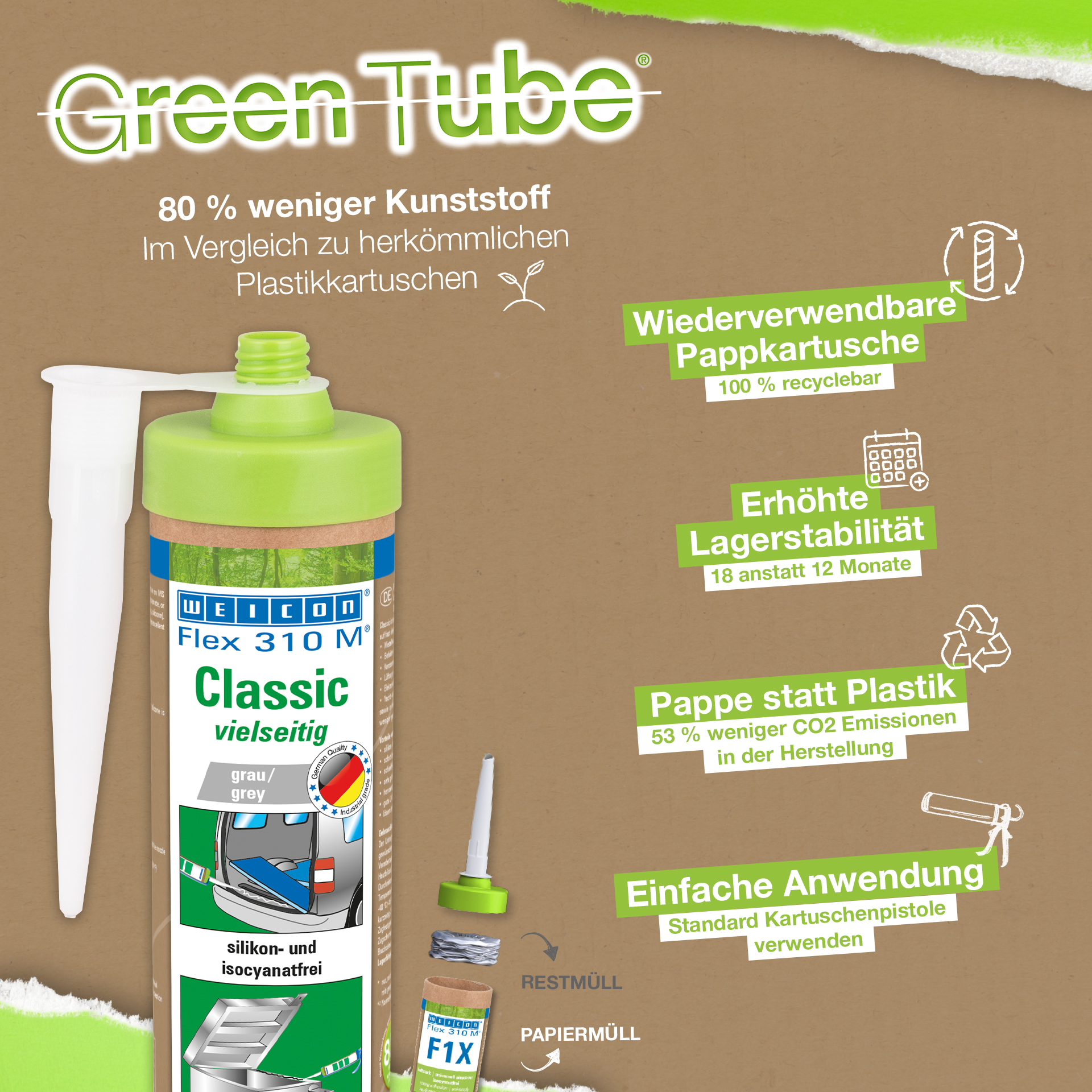 WEICON Flex 310M Classic heeft een sterke hechting, is “nat op nat” overschilderbaar, schuurbaar, heeft een uitstekende verouderingsbestendigheid en een goede UV-stabiliteit. Het is bestand tegen zoet- en zoutwater, en is vrij van siliconen, isocyanaten, halogenen en oplosmiddelen. Het product is ISEGA gecertificeerd und kan als lijm in de levensmiddelentechnologie worden gebruikt. Flex 310M Classic is een elastische lijm op MS-Polymeer basis en is geschikt voor verlijmingen van metalen, vele kunststoffen, keramiek, hout, glas en steen. Het lijm- en afdichtingsmiddel kan in de metaalbouw, in mediumhouder- en apparatenbouw, in carroserie-, voertuig- en containerbouw, in de ventilatie- en airconditioningtechniek, in de electro-industrie, in de jacht- en bootsbouw, en overal daar waar siliconen, danwel silicoonhoudende producten niet geschikt zijn, worden toegepast.