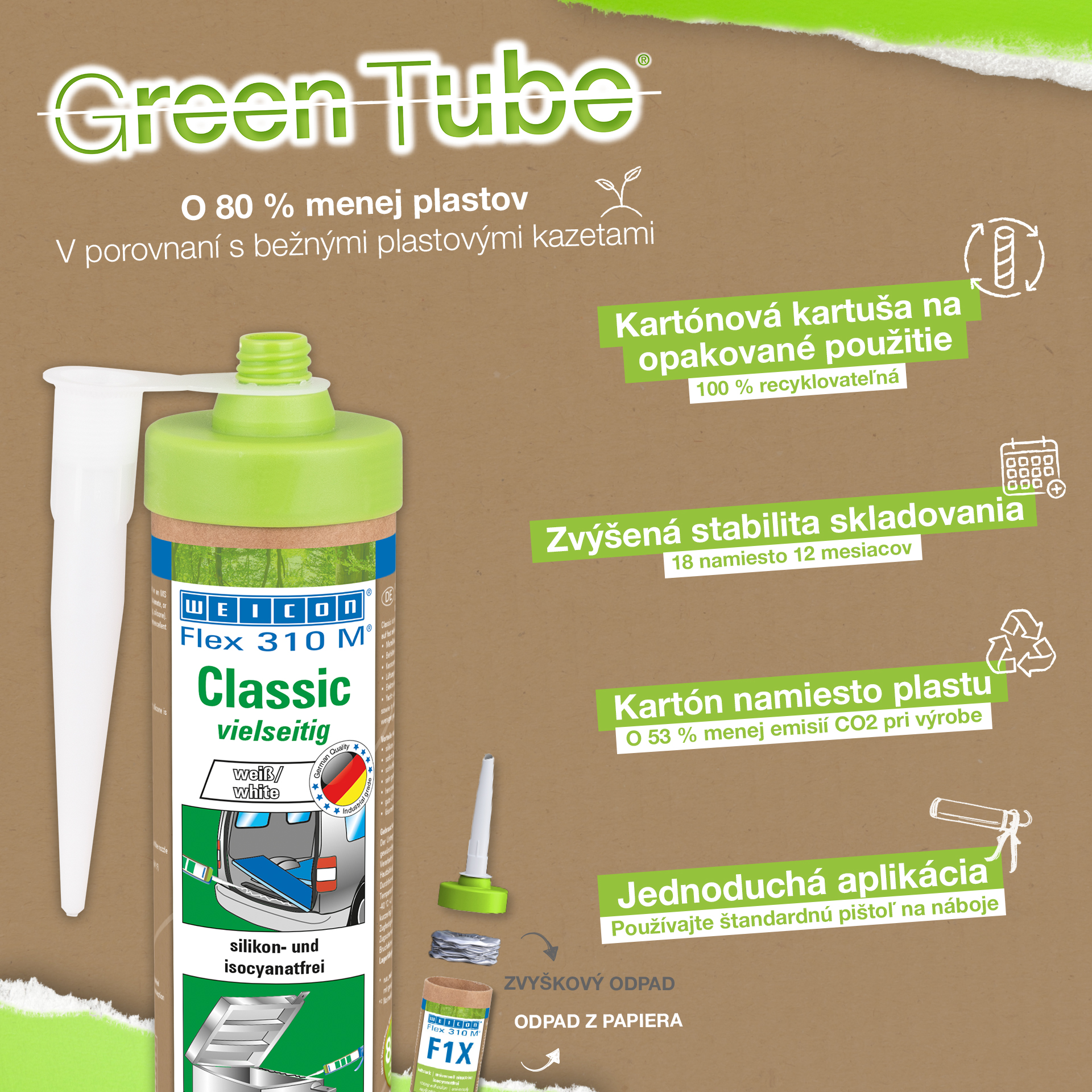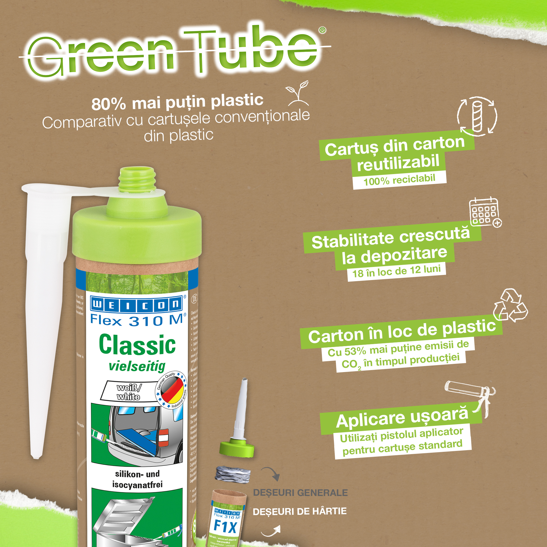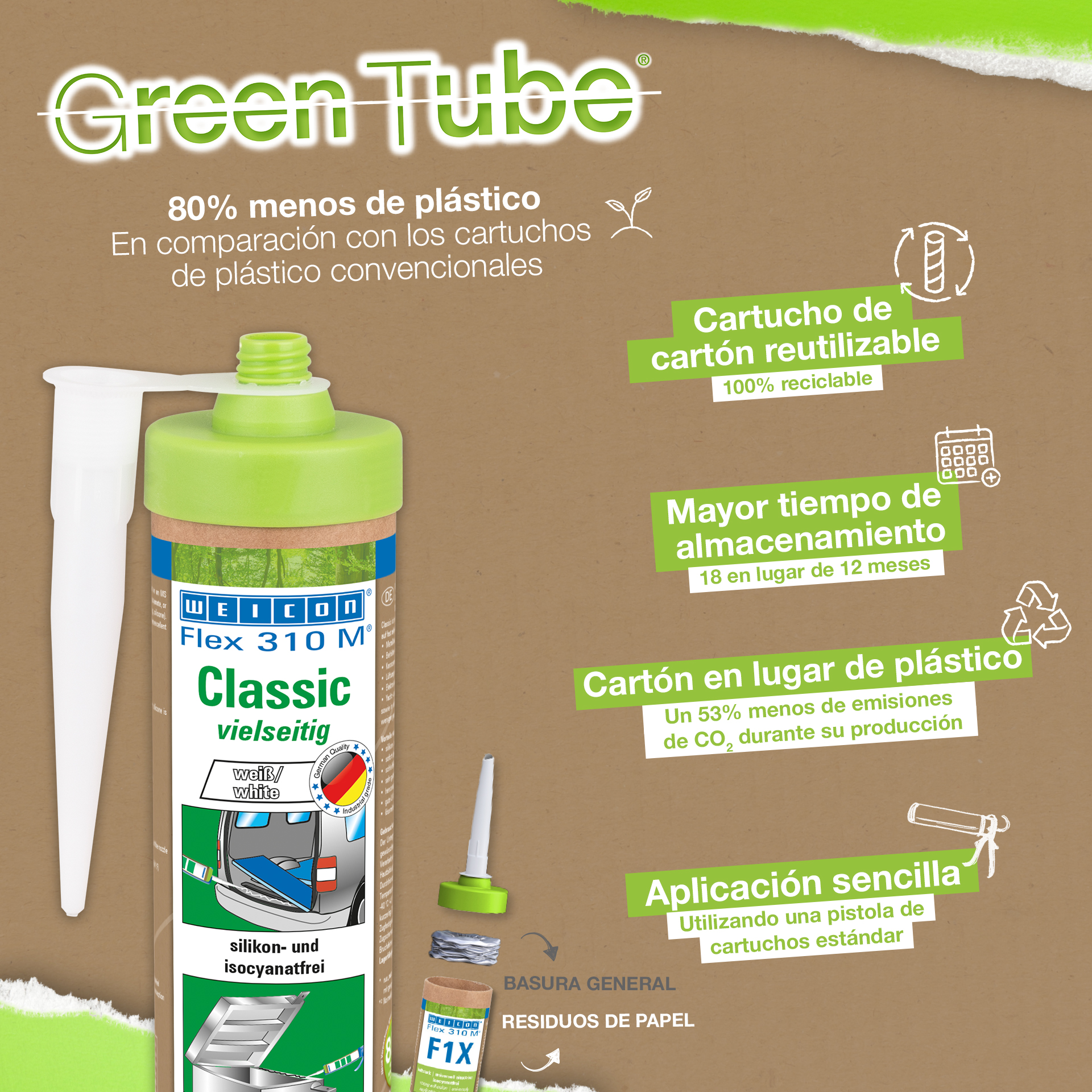 WEICON Flex 310M Classic heeft een sterke hechting, is “nat op nat” overschilderbaar, schuurbaar, heeft een uitstekende verouderingsbestendigheid en een goede UV-stabiliteit. Het is bestand tegen zoet- en zoutwater, en is vrij van siliconen, isocyanaten, halogenen en oplosmiddelen. Het product is ISEGA gecertificeerd und kan als lijm in de levensmiddelentechnologie worden gebruikt. Flex 310M Classic is een elastische lijm op MS-Polymeer basis en is geschikt voor verlijmingen van metalen, vele kunststoffen, keramiek, hout, glas en steen. Het lijm- en afdichtingsmiddel kan in de metaalbouw, in mediumhouder- en apparatenbouw, in carroserie-, voertuig- en containerbouw, in de ventilatie- en airconditioningtechniek, in de electro-industrie, in de jacht- en bootsbouw, en overal daar waar siliconen, danwel silicoonhoudende producten niet geschikt zijn, worden toegepast.