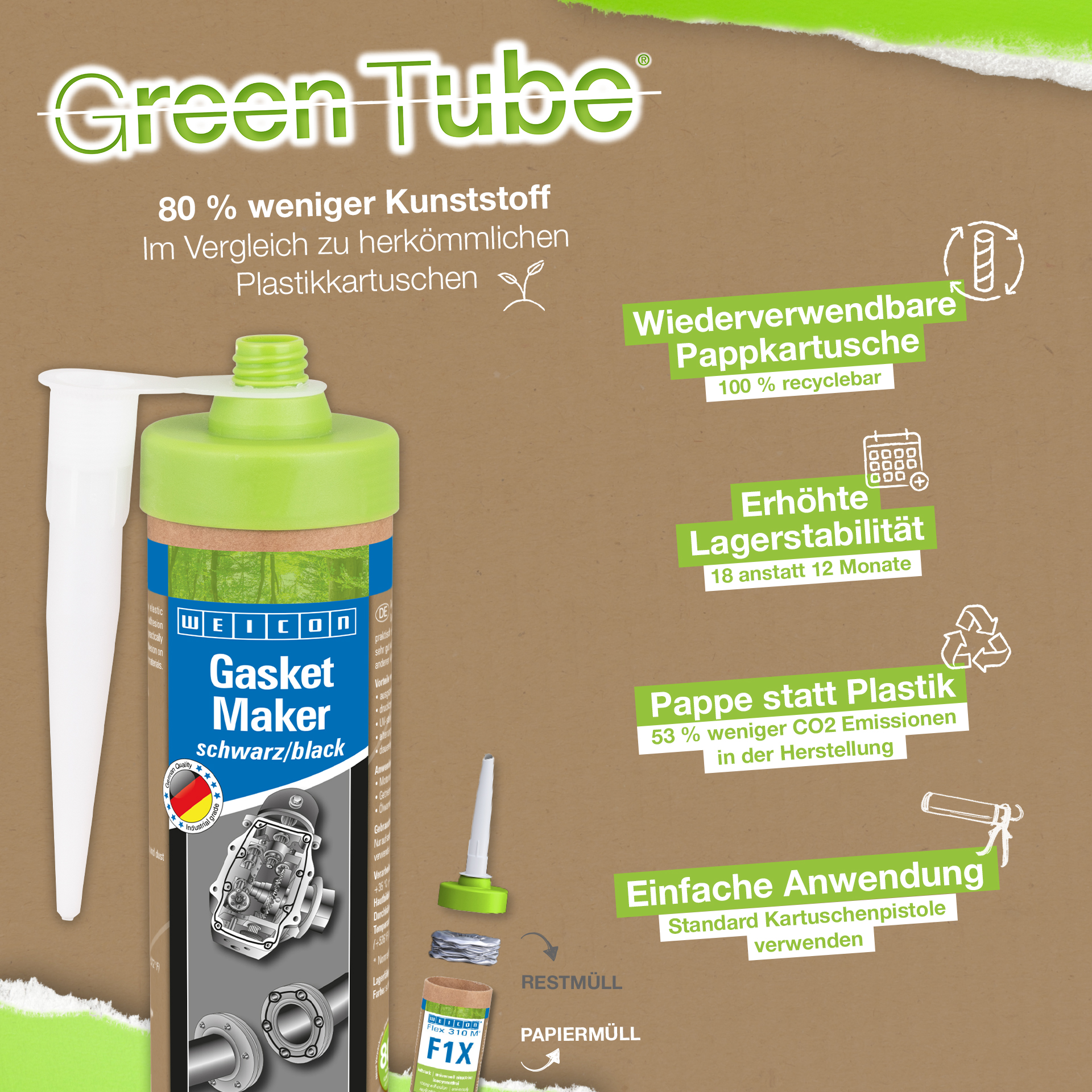 WEICON Gasket Maker is een hechtsterk, duurzaam elastisch, speciaal afdichtingsmiddel, welke door luchtvochtigheid praktisch krimpvrij uithardt. Gasket Maker hecht zeer goed op staal, aluminium, glas, keramiek en vele andere materialen. Gasket Maker beschikt over een uitstekende temperatuurs-, olie- en vetbestendigheid, is drukbestendig, Uv-bestendig, verouderingsbestendig en duurzaam elastisch. Het speciale afdichtingsmiddel kan op motoren en waterpompen, tandwielen en assen, oliecarters enz. gebruikt worden.