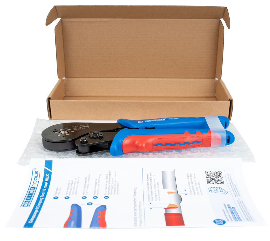 De krimptang 16 mm² HEX is speciaal ontwikkeld voor het procesveilig krimpen van adereindhulzen. Zes synchroon aangedreven krimpklemmen vormen een zeshoekige persing, die het inbrengen bij ronde aansluitklemmen vergemakkelijkt. Het zeshoekige krimpprofiel met getande persbekken van meervoudig gehard koolstofstaal zorgt voor duurzame elektrische verbindingen. Een zelfinstellende aanpassing aan de gewenste adereindhuls maakt snel werken bij verschillende doorsneden mogelijk. De tang heeft een ratelmechanisme met gedwongen vergrendeling voor een constant hoge krimpkwaliteit en herhaalbaar werk. De krimptang gaat pas open als het krimpproces volledig is voltooid. Bovendien is er een noodontgrendeling in de handgreep geïntegreerd, die de tang weer opent in geval van verkeerd gebruik. Met de nauwkeurige excentrische instelling kan de krimpkracht exact worden afgesteld. Hierdoor levert de tang een blijvend hoge krimpkwaliteit. Met de krimptang 16 mm² HEX kunnen adereindhulzen in het werkbereik van 0,5-16 mm² (AWG 20-5) worden bewerkt. De 2-componentenhandgrepen van de tang garanderen een slipvast en ergonomisch werken met maximale krachtoverbrenging. Hierbij is gebruikgemaakt van het beproefde "Ice-Crack-Design", dat zorgt voor een aangenaam gevoel. De geïntegreerde oogjes aan de handgrepen dienen voor het bevestigen van een valbeveiliging