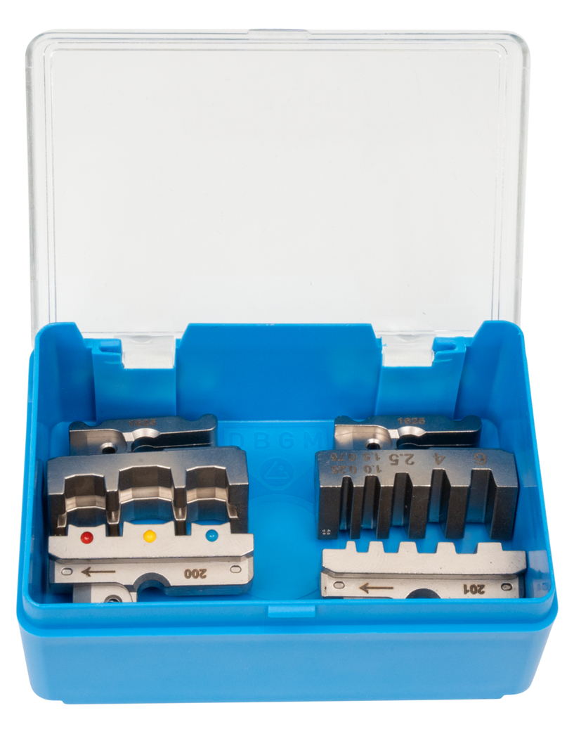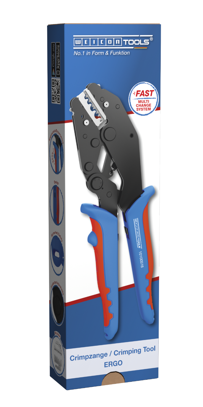 De ERGO-krimptang is ontwikkeld voor het procesveilig krimpen van verschillende elektrische connectoren. De tang heeft een ratelmechanisme met gedwongen vergrendeling voor een constant hoge krimpkwaliteit en voor herhaaldelijk nauwkeurig werken. Het mechanisme opent de tang pas wanneer het krimpproces volledig is voltooid. Bovendien is er een noodontgrendeling in de handgreep geïntegreerd, waarmee de tang indien nodig, bijvoorbeeld bij verkeerd gebruik, weer kan worden geopend. Een ander kenmerk is de instelbare krimpkracht, die via een nauwkeurige excentrische instelling zorgt voor een hoge krimpkwaliteit. Met het Multi Change System kunnen de krimpmodules indien nodig snel worden verwisseld. Dit gereedschaploze en ongecompliceerde verwisselingsproces zorgt voor een snelle in- en uitbouw van de modules. De ERGO-krimptang wordt geleverd met drie moduleparen van hoogwaardig staal. Eén module is geschikt voor MC4-stekkers met kabeldiameters van 2,5 mm², 4 mm² en 6 mm² (14-10 AWG). Eén modulepaar is geschikt voor geïsoleerde adereindhulzen van 0,25-6 mm² (AWG 24-10). Het derde modulepaar is ontwikkeld voor geïsoleerde kabelschoenen van 0,5-6 mm² (AWG 22-10). De drie moduleparen worden in een kleine plastic doos bewaard, zodat ze veilig en stofvrij kunnen worden opgeborgen. Daarnaast zijn er nog meer moduleparen als accessoire verkrijgbaar. De 2-componentenhandgrepen zorgen voor antislip en ergonomisch werken voor maximale krachtoverbrenging. Hierbij is voortgebouwd op het beproefde "Ice-Crack-Design", dat tegelijkertijd voor een aangenaam gevoel zorgt. De geïntegreerde ogen aan de handgrepen dienen voor het bevestigen van een valbeveiliging
