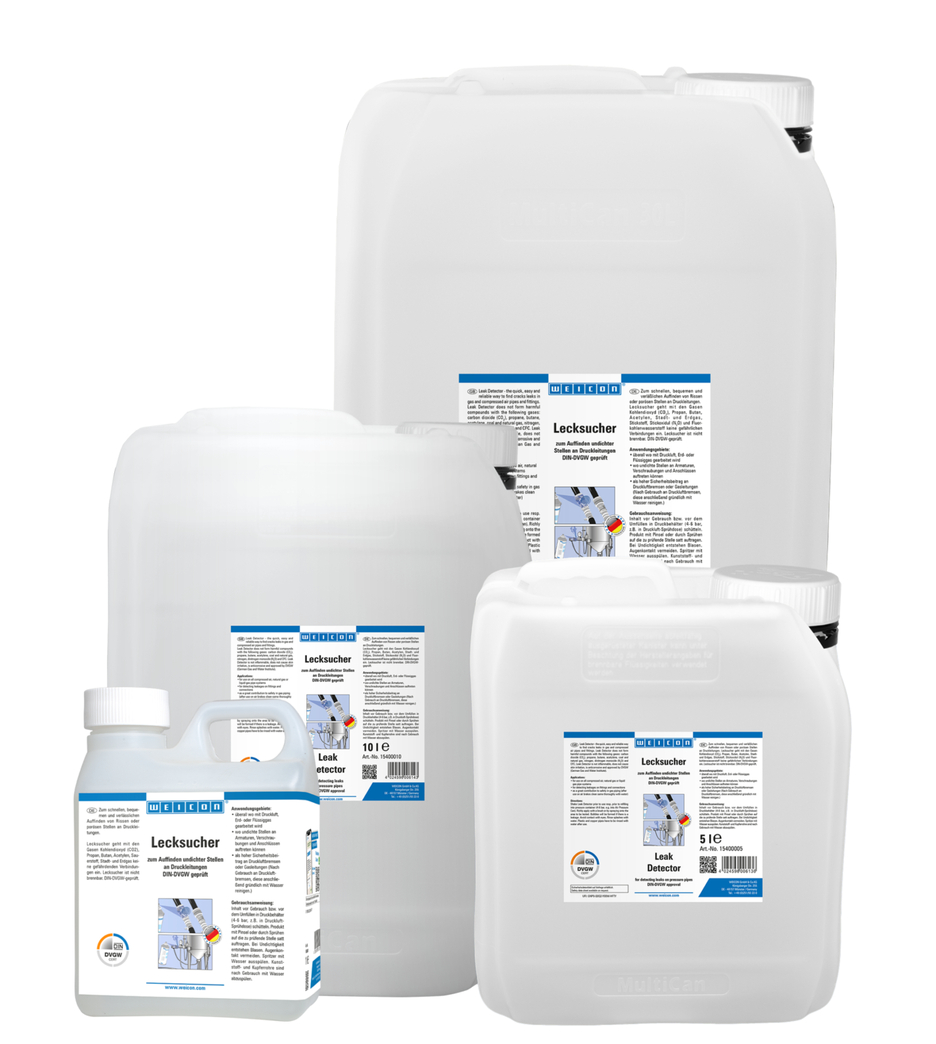 WEICON Lekzoek Spray is voor het snel, comfortabel en betrouwbaar opsporen van lekkages (scheuren of poreuze plaatsen) in persleidingen. Lekzoek Spray vormt geen schadelijke verbindingen met koolstofdioxide (CO2), propaan, butaan, acetyleen, zuurstof, stad- en aardgas. Het kan overal, waar met perslucht, aardgas of vloeibaar gas wordt gewerkt, waar lekkage van kranen, schoefverbindingen en aansluitingen optreden en als een grotere bijdrage voor de veiligheid van luchtremmen en gasleidingen, worden toegepast.