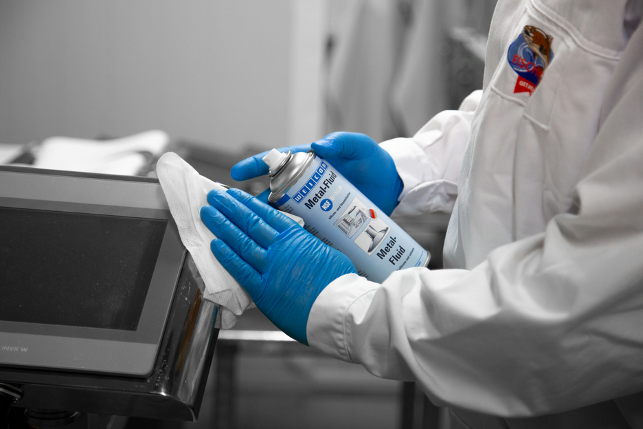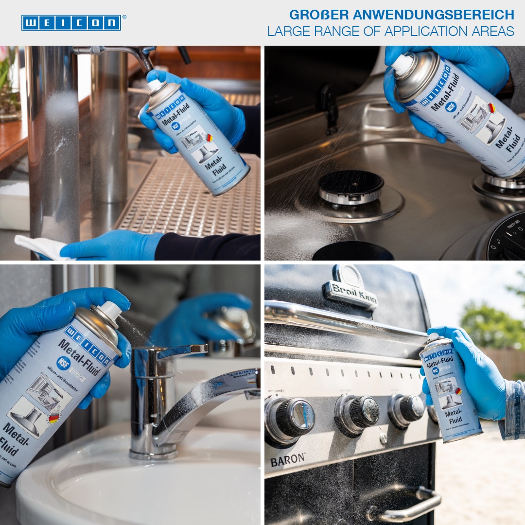 WEICON Metal-Fluid is een effectief product voor het reinigen, beschermen en onderhouden van matte- en gepolijste metaaloppervlakken en beschikt over een NSF goedkeuring. Metal-Fluid beschermt, verzorgt en reinigt zowel metalen oppervlakken alsook keramiek, hout, glas en kunststoffen. Geëtste of gedrukte markeringen en kunststof oppervlakken worden niet aangetast.