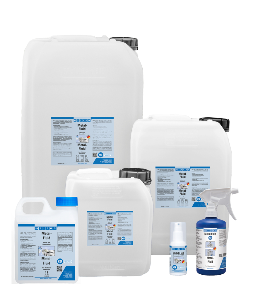 WEICON Metal-Fluid is een onderhouds- en reinigingsmiddel voor matte- en gepolijste oppervlakken, voor indoor gebruik en beschikt over een NSF goedkeuring. Metal-Fluid beschermt, verzorgt en reinigt zowel metalen oppervlakken alsook keramiek, hout, glas en kunststoffen. Geëtste of gedrukte markeringen en kunststof oppervlakken worden niet aangetast.