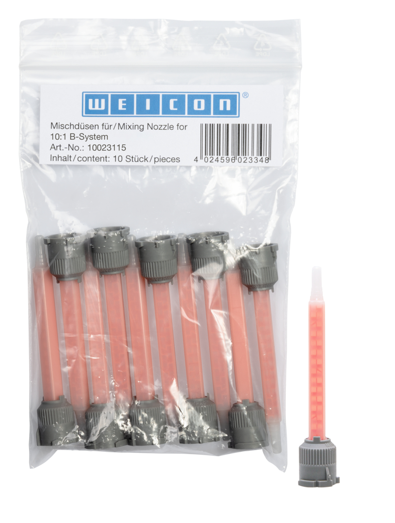 Het 10:1 B mengmondstuk is speciaal ontwikkeld voor tweecomponenten lijmsystemen. Het gebruik van het mengmondstuk ondersteunt de kwaliteitsborging bij verlijmingsprocessen en zorgt voor reproduceerbare resultaten. Dit is vooral belangrijk voor industriële serieproductie. De mengmondstukken ondersteunen de kwaliteit en professionele productie van lijmverbindingen en leiden tot een verbetering van de lijmprocessen. Dankzij de geometrie van het mengmondstuk, dat precies is afgestemd op de mengverhouding, worden altijd de juiste hoeveelheden hars en verharder gemengd. Het gebruik van het mengmondstuk zorgt voor veilig en schoon werken en verhoogt de efficiëntie door de foutkosten aanzienlijk te verlagen.