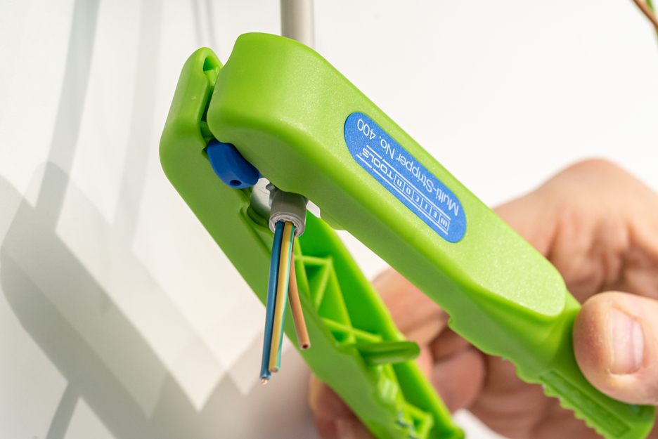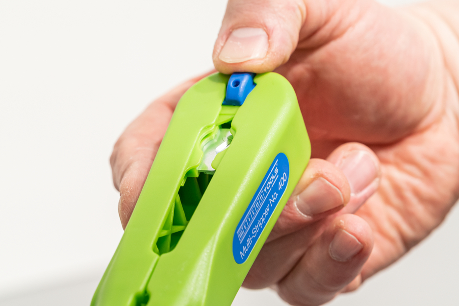 WEICON Multi-Stripper Nr. 400, een universeel afbijtgereedschap voor de functies: Cirkelsnijden - lengtesnijden - strippen - knippen. Met dit gereedschap kunnen kabels gemakkelijk worden gestript, zelfs op moeilijk bereikbare plaatsen, bijv. in plafond- en wandzones, in aftak- en verdeelkasten, schakelkasten. Met het contourmes kunnen draaddoorsnedes van 0,5 mm², 0,75 mm², 1,5 mm², 2,5 mm², 4,0 mm² en 6,0 mm² gestript worden. Er is ook een gemakkelijk toegankelijke zijsnijder geïntegreerd in de Multi-Stripper No.400, die gebruikt kan worden voor flexibele kabeldiameters tot 6 mm (massieve geleiders tot 4 mm diameter).
