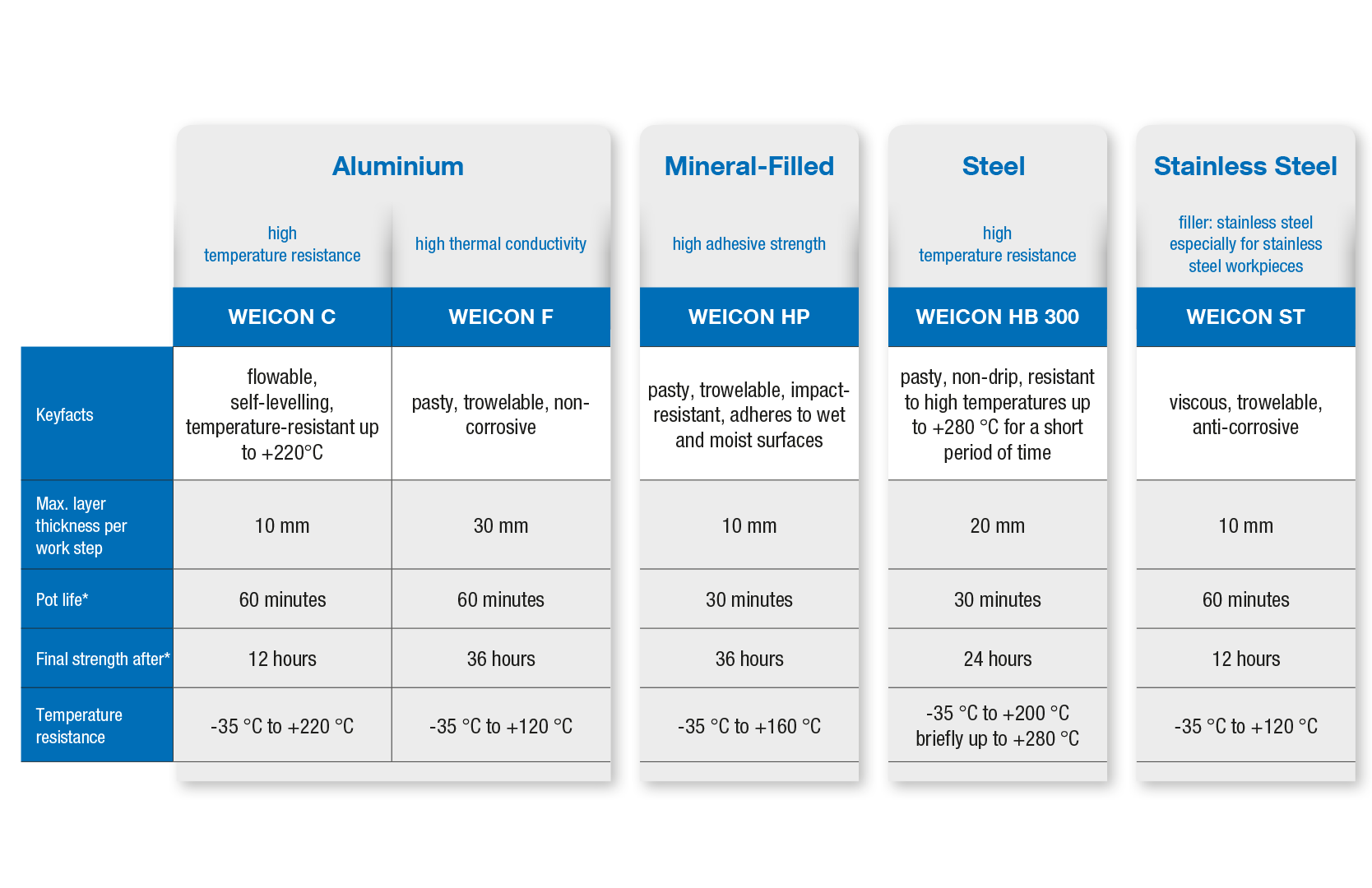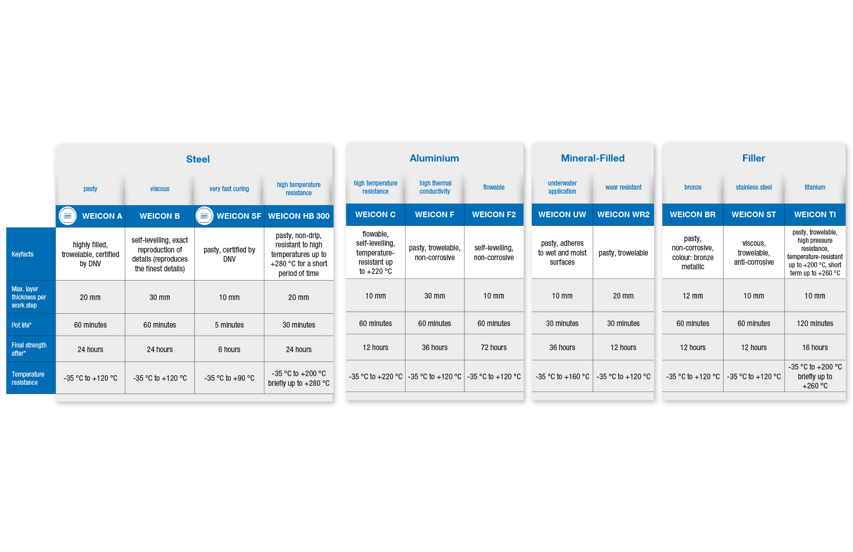 WEICON biedt een hele reeks producten die als gietmassa, voor opvulling en voor spleetcompensatie kunnen worden ingezet. Ze vinden ook hun weg bij de productie van prototypes of bevestigingsmiddelen. De speciaalproducten kunnen ook worden toegepast voor de reparatie van transportsystemen, glijbanen of geleiderails. De epoxyharsen bieden uitkomst in de staalbouw, het spoor, kraaninstallaties en bij de brugreparatie. De voordelen van deze reparatiesystemen zijn een hoge vloeibaarheid, een hoge adhesie en een zeer goede drukbestendigheid. Bovendien bieden ze langdurige corrosiebescherming.