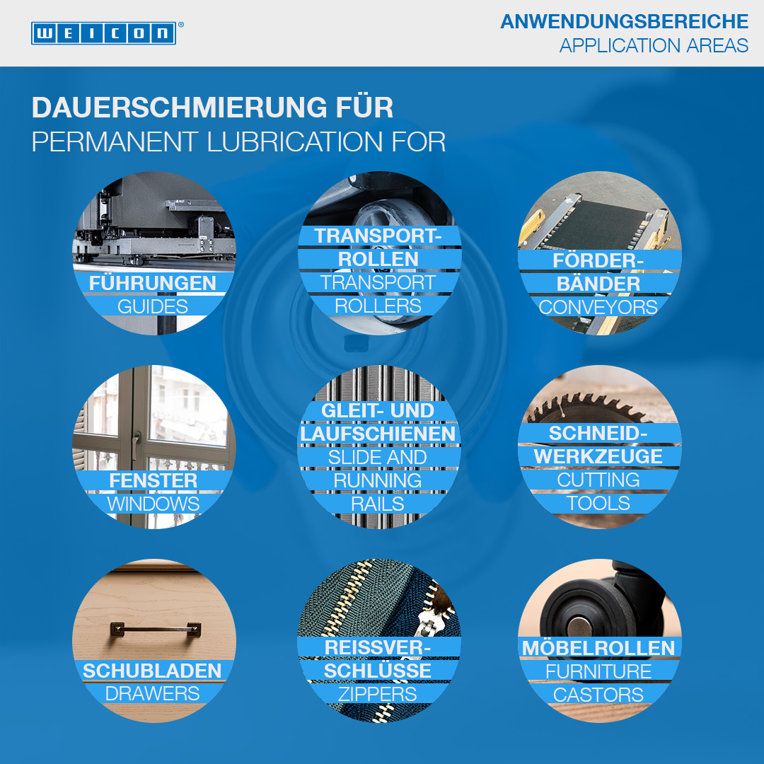 WEICON PTFE-Spray is een vetvrij droogsmeermiddel, met een afstotend effect op basis van PTFE. PTFE-Spray hecht aan alle metalen, kunststoffen en houten oppervlakken. Dankzij het hoge PTFE aandeel is het wrijvingscoëfficiënt aanzienlijk verminderd De coating is vuil-, stof- en waterafstotend, en oliën-, vetten-,tegen vele chemicaliën-bestendig. WEICON PTFE-Spray wordt als smering gebruikt op glijbanen en geleidingssystemen, op transportbanden, -rollen en -hellingen, op ramen, op snijdgereedschappen en verpakkingsmachines Ook kan het gebruikt worden als waterafstotende bescherming van papier-, kurk- en afdichtingpakkingen, in plaats van scheidingsmiddelen welke siliconen bevatten en overal daar waar olie- of vetsmering niet toegestaan of gewenst is.