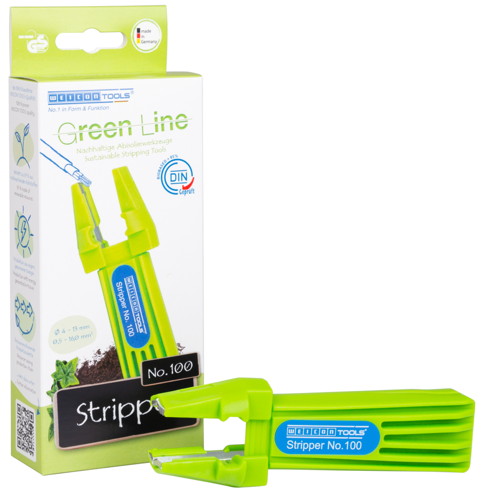 Met de Green Line is een zeer speciale serie gereedschap ontwikkeld. De gereedschappen zijn gemaakt van tot 97 % hernieuwbare grondstoffen, zijn recyclebaar en hebben een uitstekende milieubalans. WEICON Stripper No. 100 is een universeel gereedschap voor het strippen en afstrippen van een grote verscheidenheid aan kabeltypen en doorsneden, zoals gebruikt in alle huishoudelijke installaties. Met dit gereedschap kunnen ronde en overlangse sneden worden gemaakt zonder de snijdiepte aan te passen. Bijzonder geschikt voor vlak strippen in plafond- en wandzones, bijv. in aftak- en verdeelkasten. Ook zeer geschikt voor geleidelijk strippen bij het aansluiten van satellietsystemen. Het werkbereik voor de No.100 is 0,5 - 16 mm² / 4 - 13 mm Ø.