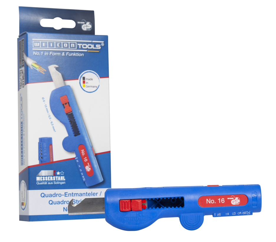 * Veilige rond- en lengtesnede alsmede een kort ontmantelen ook aan moeilijk toegankelijke plekken in plafond en wand, in aftak- en verdeelkasten, schakelkasten etc. * Geen instelling van de snijdiepte: het gereedschap is voor het werken met NYM kabels bv. 3 x 1,5 mm² tot 5 x 2,5 mm² geoptimaliseerd. * Anti-slip handgreep en daardoor eenvoudig gebruik bij de dagelijkse arbeid. * Snel en moeiteloos werken door nieuwe vorm van mesinstelling voor de lengtesnede. * 100% Made in Germany * Uit glasvezel versterkt polyamide - robuust, ergonomisch gevormd, ligt goed in de hand. * Hoogwaardig staal uit Solingen, daardoor messen met lange levensduur * TÜV/GS getest op gebied van arbeidsveiligheid De Quadro-ontmantelaar No. 16 is een nieuw ontwikkeld gereedschap voor de professionele industriële gebruiker en voor handwerkers. Het 4 in 1 gereedschap biedt meerdere functies: Rondsnede - lengtesnede - strippen - snijden. Daardoor kan één gereedschap meerdere anderen vervangen. Dit spaart geld en plek in de gereedschapskoffer De optimale geïntegreerde kabelvoering in het gereedschap zorgt voor een veilig, precies en comfortabel strippen van alle gangbare ronde en vochtafwerende kabels met een diameter van 8,0 - 13,0 mm (bv. NYM - 3 x 1,5 mm² tot 5 x 2,5mm²). Door de ergonomische handgreep is het gereedschap ligt het gereedschap zeer goed in de hand. De voorgevormde handgreep zorgt ervoor dat de Quadro-ontmantelaar No. 16 goed en veilig in de hand ligt, en bij gebruikt niet slipt. Dit vereenvoudigd het dagelijks werk en verhoogd tegelijkertijd de veiligheid Kabels kunnen ook op moeilijk bereikbare plaatsen of in aftak- en verdeelkasten ontmanteld en gestript worden. De snijdiepte hoeft niet manueel gereguleerd te worden. Alle gangbare flexibele en massieve kabels met een dwarsdoorsnee van 0,5 - 6 mm² kunnen in het geïntegreerde stripgedeelde verwerkt worden. Het universele gereedschap heeft een uitschuifbaar haakmes dat in iedere positie in te stellen is en eenvoudig te verwisselen is.