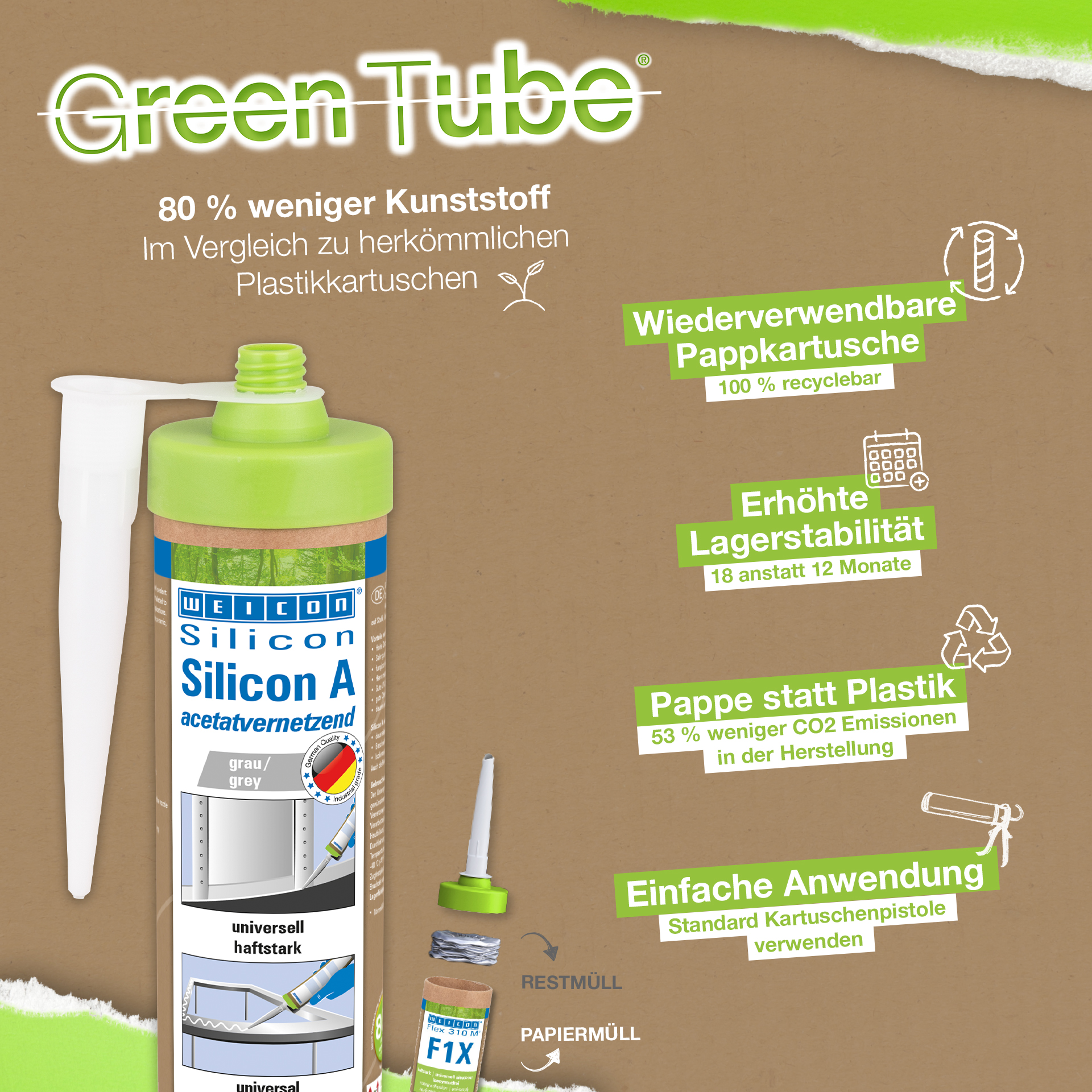 WEICON Siliconen A is oplosmiddelvrij, acetaatverbindend, sterk hechtend, duurzaam elastisch, verouderings-, chemicaliën- en temperatuursbestendig tot +200 °C(+392 °F), extreem elastisch (rek bij breuk >700%) en universeel inzetbaar. Siliconen A hecht zeer goed op staal, aluminium, glas, keramiek en vele andere materialen. Siliconen A kan worden gebruikt in de machine- en installatiebouw, in de ventilatie- en airconditioningstechniek, in de energie- en elektrotechniek, in de beurs- en winkelinrichting en in vele andere sectoren van de industrie.