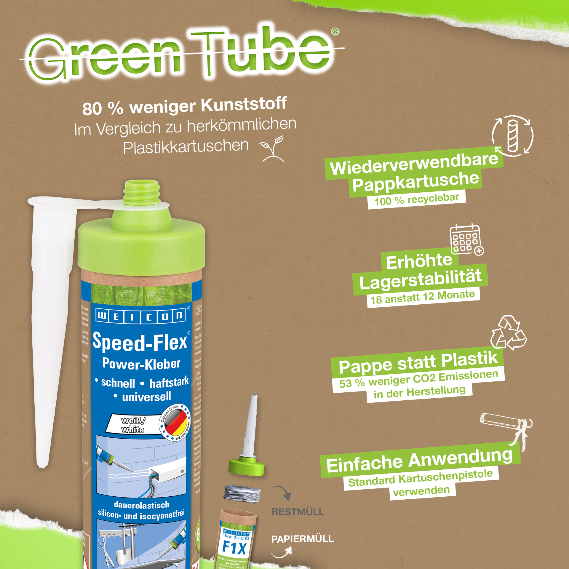 Speed-Flex is sterk hechtend, pasteus, stabiel, overschilderbaar "nat in nat", bestand tegen veroudering, verwering, UV-bestendig en vrij van siliconen, isocyanaat, halogeen en oplosmiddelen. Speed-Flex is ISEGA-gecertificeerd en kan worden gebruikt als lijm in de levensmiddelentechnologie. De lijm en kit heeft een MS polymeer basis en heeft een extreem sterke initiële hechting en is geschikt voor het verlijmen van metalen, vele kunststoffen, keramiek, hout, glas en steen. Speed-Flex vervangt conventionele bevestigingen zoals schroeven, pluggen, klinknagels enz. Dankzij de zeer hoge aanvangshechting is verlijming zelfs mogelijk op verticale oppervlakken binnen en buiten. Het product kan worden gebruikt in gipsplaat- en interieurbouw, in de metaalbouw, in de tank- en apparatenbouw, in ventilatie- en airconditioningtechnologie, in de stand- en winkelinrichting en overal waar siliconen of producten die siliconen bevatten niet geschikt zijn.