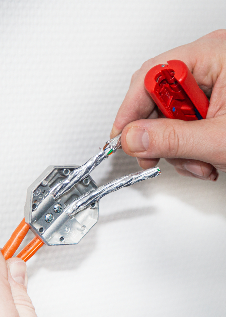 Voor geïsoleerde PVC-Datakabels (bv. Cat5, Cat6, Cat7, Twisted-Pair-Kabels) met een doorsnede van 4,5 - 10 mm Instellen van de snijdiepte niet nodig De precieze mes-instelling zorgt voor een optimaal ontmantelen van de buitenisolering. Met het tweede mes wordt de foliebescherming passend ingesneden zodat deze eenvoudig verwijderd kan worden.