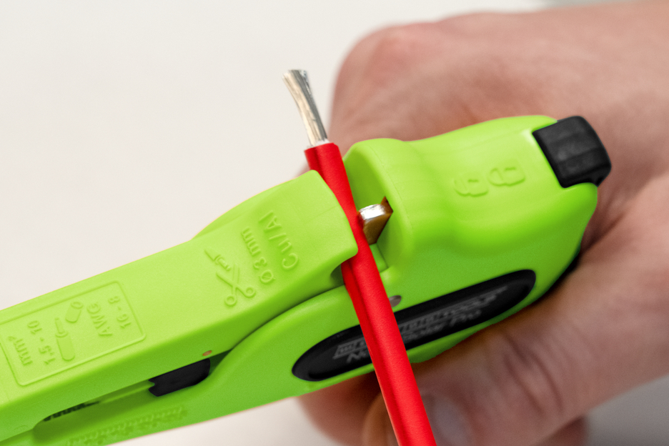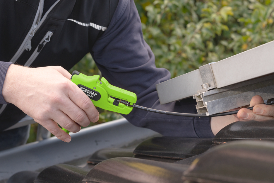 Speciaal gereedschap voor het strippen en ontmantelen van gangbare kabels in de zonne-energiesector I groot, krachtig werkbereik van 1,5 mm² - 10 mm² I nauwkeurig werken dankzij verstelbare lengte-aanslag (5 - 25 mm) I geïntegreerde, goed toegankelijke zijsnijder tot 3 mm Ø Cu/Al I ergonomisch gevormde, antislip handgreep van meerdere componenten