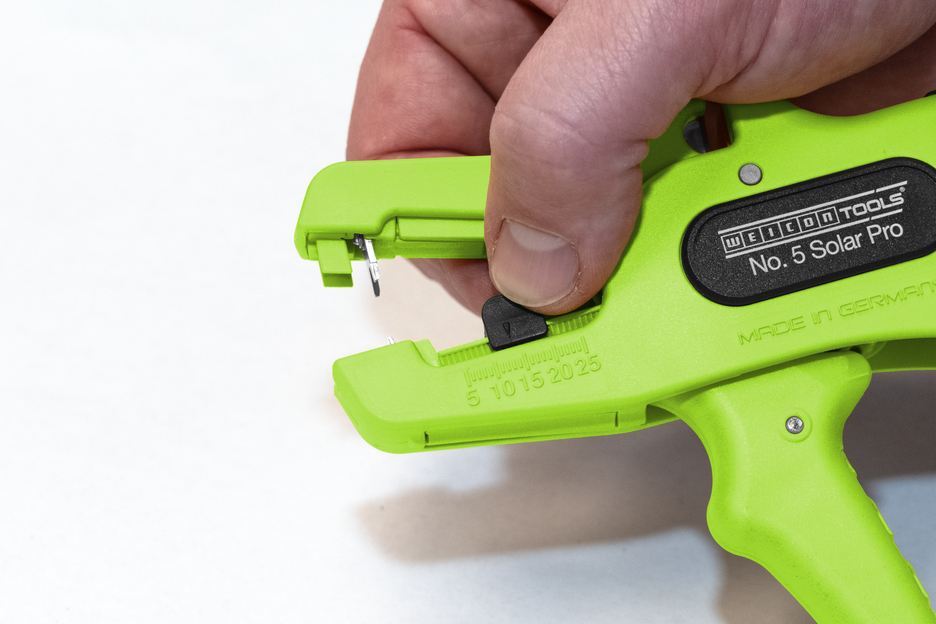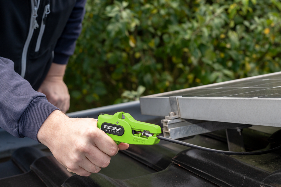 De automatische tang wordt gebruikt voor het strippen van alle gangbare solarkabels, zoals H1Z2Z2-K van 1,5 tot 10 mm². Dankzij een verstelbare lengte-aanslag van 5 tot 25 mm kan zeer nauwkeurig en precies worden gewerkt. De messen van de stripptang nr. 5 Solar Pro zijn extra gehard om meerlaagse rubberen isolatie probleemloos te kunnen verwijderen. De lengtebegrenzer kan indien nodig ook worden verwijderd. De tang past zich automatisch aan de betreffende geleiderdoorsnede aan, zodat handmatige afstelling niet nodig is. In de tang is een zijkniptang geïntegreerd die geschikt is voor koperen en aluminium geleiders met een diameter tot drie millimeter. Door het slanke ontwerp van het gereedschap kan de tang ook worden gebruikt in moeilijk bereikbare werkgebieden, zoals op zonnepanelen of op de omvormer. De mechanica van de tang werkt zeer soepel en heeft zich in tests bewezen als duurzaam en betrouwbaar. De tang heeft een antislip handgreep van meerdere componenten in het geel-zwarte “Ice-Crack”-design. De striptang heeft een oogje waaraan een band kan worden bevestigd om te voorkomen dat het gereedschap valt, en is voorzien van een labelveld om het gereedschap te kunnen personaliseren. Bovendien kan de tang worden vergrendeld, waardoor hij ruimtebesparend kan worden opgeborgen. Zoals bij alle striptangen uit de productlijn No. 5 zijn de gegalvaniseerde messen verwisselbaar.