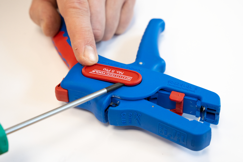 Wire Stripper No. 5 Pro: large, efficient working range from 0.2 mm² - 16 mm² | precise working due to adjustable length stop (5 - 25 mm) | integrated, easily accessible built-in side cutter up to 3 mm Ø Cu/Al |ergonomically designed anti-slip multi-component handle I LED Work Light: the integrated LED light ensures a well-illuminated working area that allows you to work safely with both hands I powerful and rechargeable lithium battery with 180 mAh I 2 hours of bright light (at level 2) after a charging time of 40 minutes I three brightness settings with up to 250 lumens, light colour: 6500K I dustproof, splash-resistant and impact-resistant housing made of polycarbonate, tested acc. to IP65 protection code I can be used with many WEICON TOOLS wire strippers