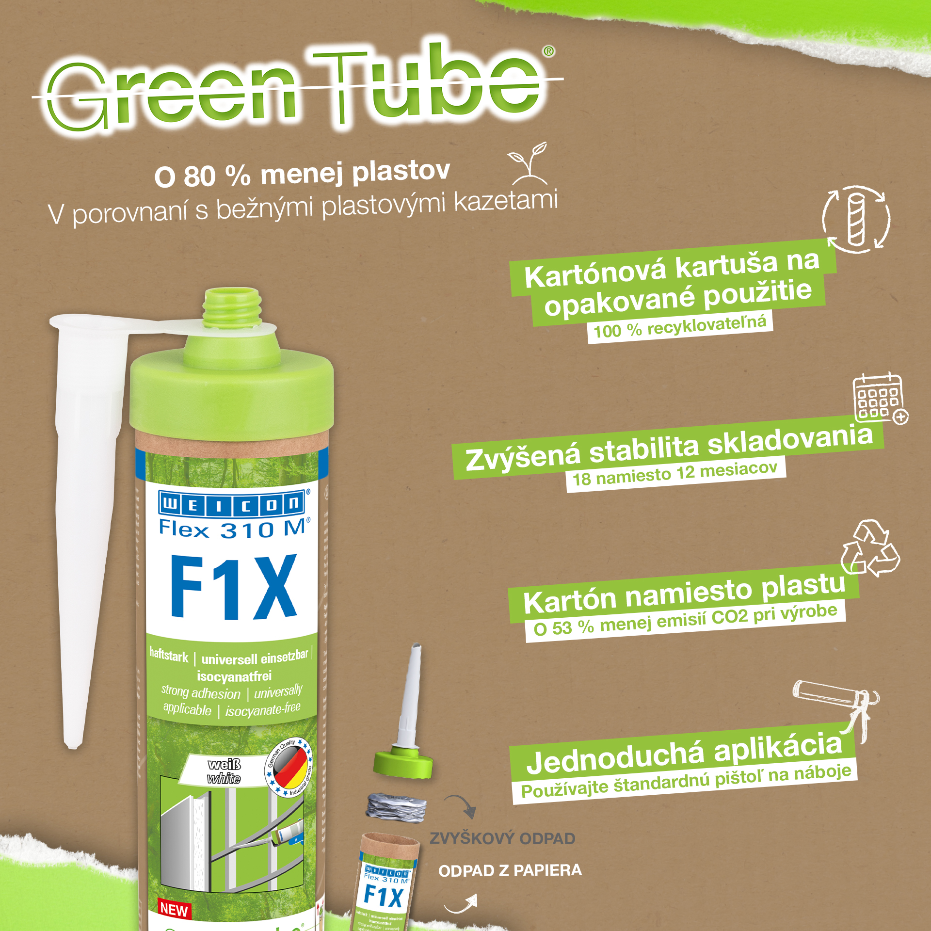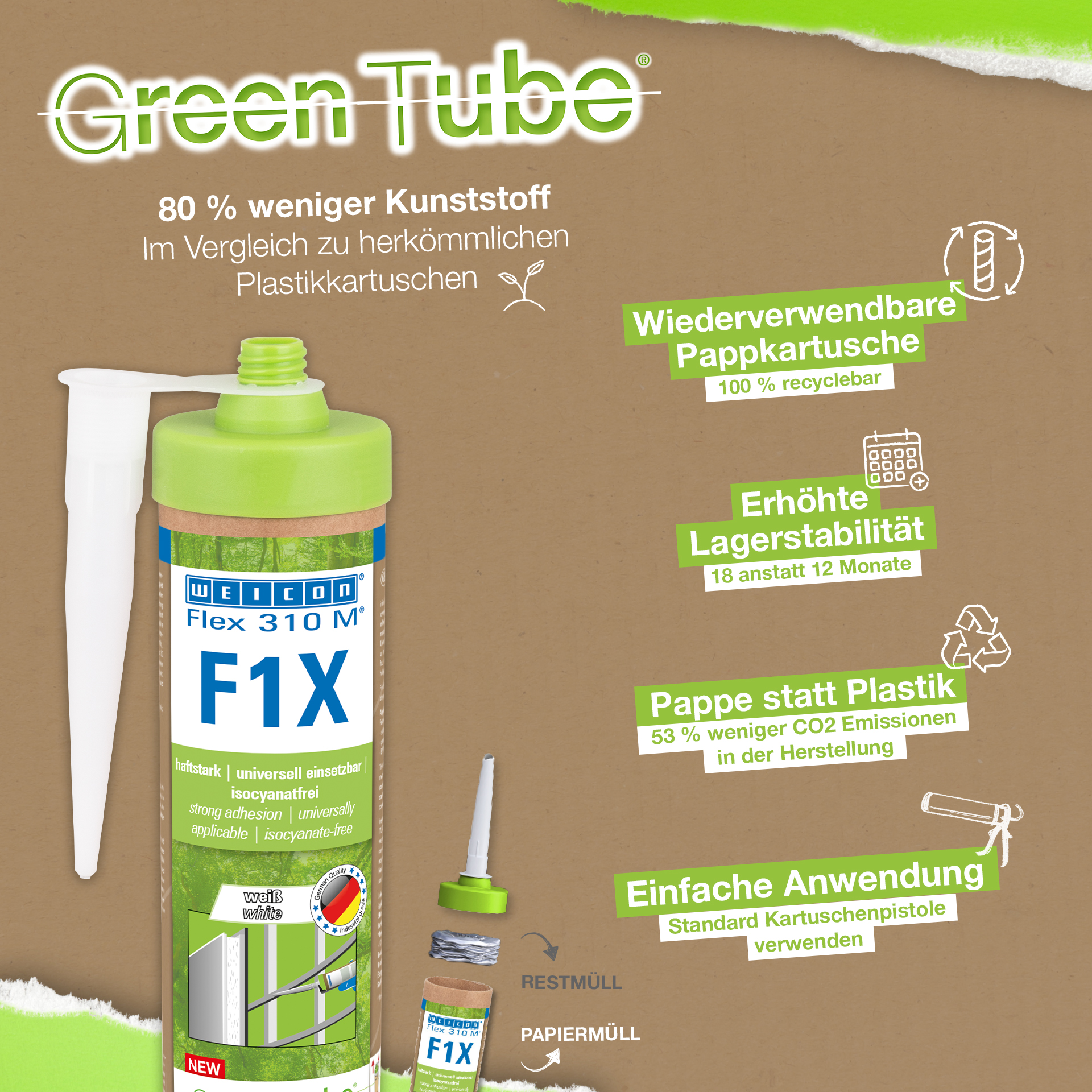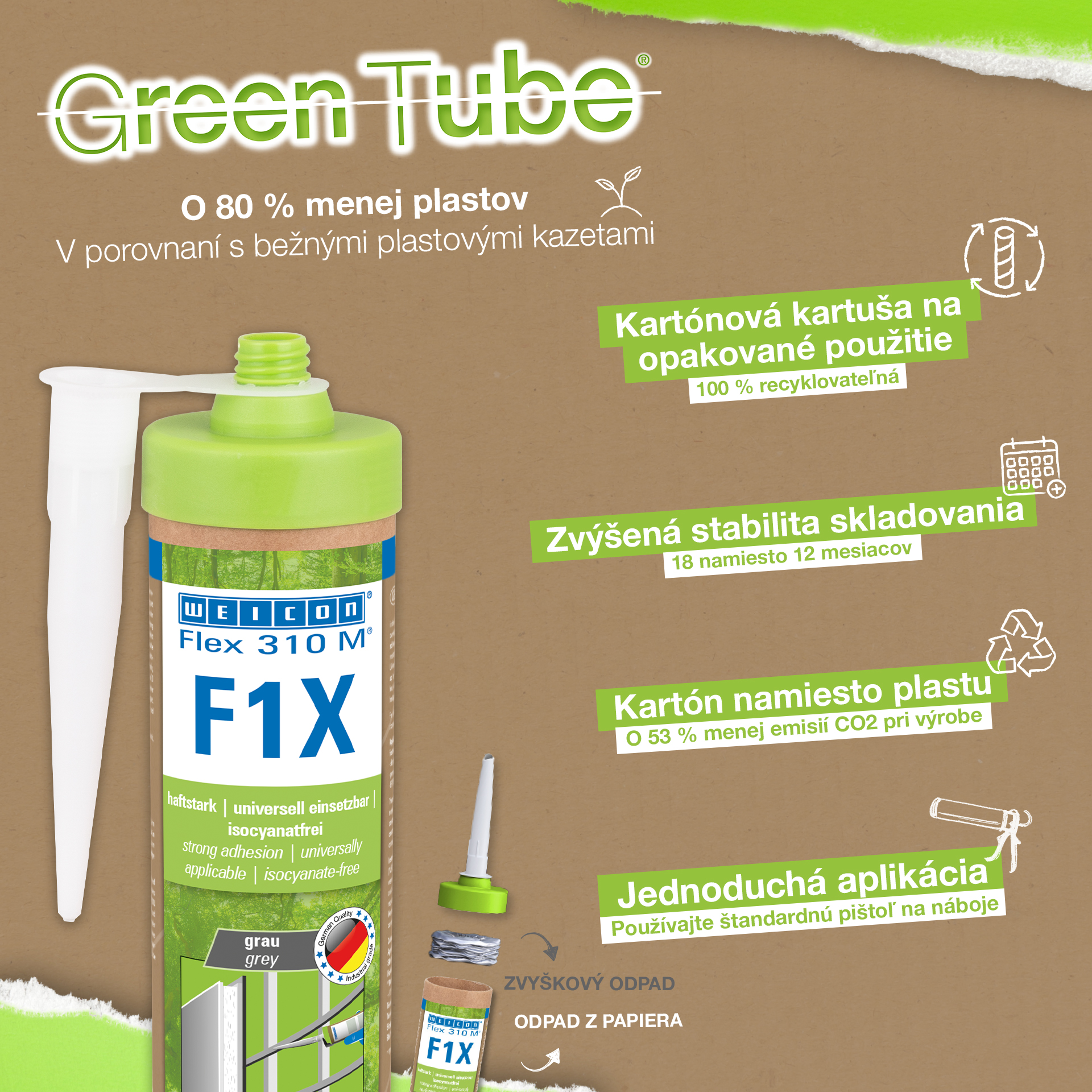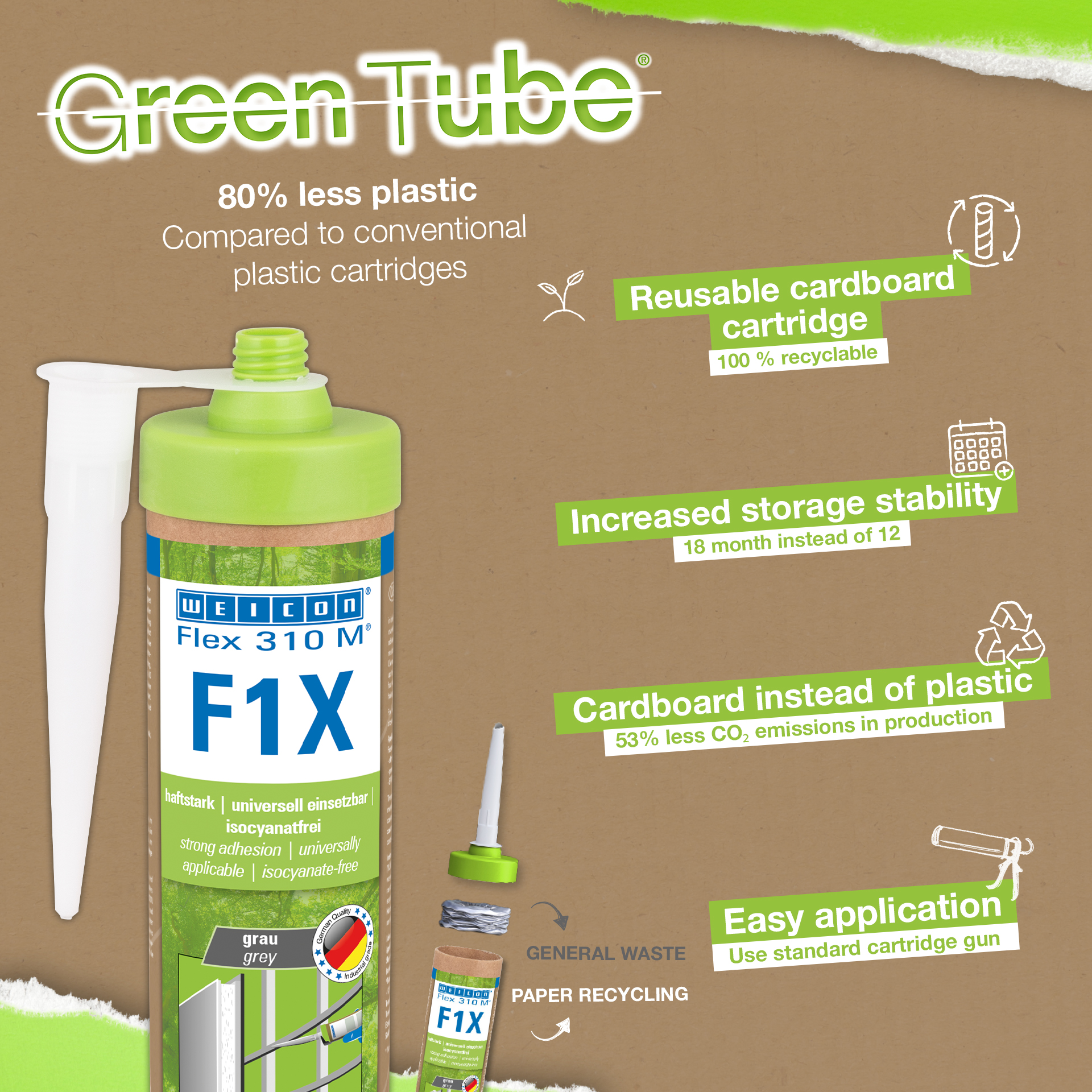 WEICON Flex 310 M F1X is een elastisch kleef- en afdichtmiddel op basis van MS-polymeren. De grijze lijm is zeer sterk en universeel geschikt voor het permanent bevestigen van bijna alle materialen op allerlei oppervlakken. Dankzij de zeer hoge aanvankelijke hechting is verlijming op verticale oppervlakken mogelijk en zelfs boven het hoofd, zowel binnen als buiten. Flex 310 M F1X kan bijvoorbeeld gebruikt worden om metalen, vele kunststoffen, keramiek, hout, glas en steen aan elkaar te lijmen. De permanent elastische lijm is "nat in nat" oververfbaar, schuurbaar, weersbestendig, vochtbestendig, verouderingsbestendig, schimmelbestendig en UV-bestendig. Het is gedurende korte tijd (tot 30 minuten) bestendig tegen temperaturen tot 180 °C en kan na een uithardingstijd van vier dagen gepoedercoat worden. De lijm en het afdichtingsmiddel bevatten geen siliconen, isocyanaat, halogeen en oplosmiddelen en zijn niet corrosief. Flex 310 M F1X kan voor het bevestigen van plinten, latten, strips, frames, panelen, platen, tegels, stenen en EPDM-folie gebruikt worden. Het kan gebruikt worden in gipsplaten en interieurbouw, in de metaalbouw, in de tank- en apparatenbouw, in de containerbouw, in ventilatie- en airconditioningtechnologie, in de beurs- en winkelbouw, in de jacht- en bootbouw en overal waar siliconen of producten die siliconen bevatten niet geschikt zijn. Duurzaam verpakt – En even sterk! Green Tube, de duurzame verpakking: de punt en het deksel bestaan 100% uit gerecycleerd kunststof, de patroon is 100 % volledig gemaakt uit karton. Minder CO2-uitstoot en plastic verbruik in vergelijking met conventionele patronen. Zonder enig voorbehoud op het gebied van prestaties!