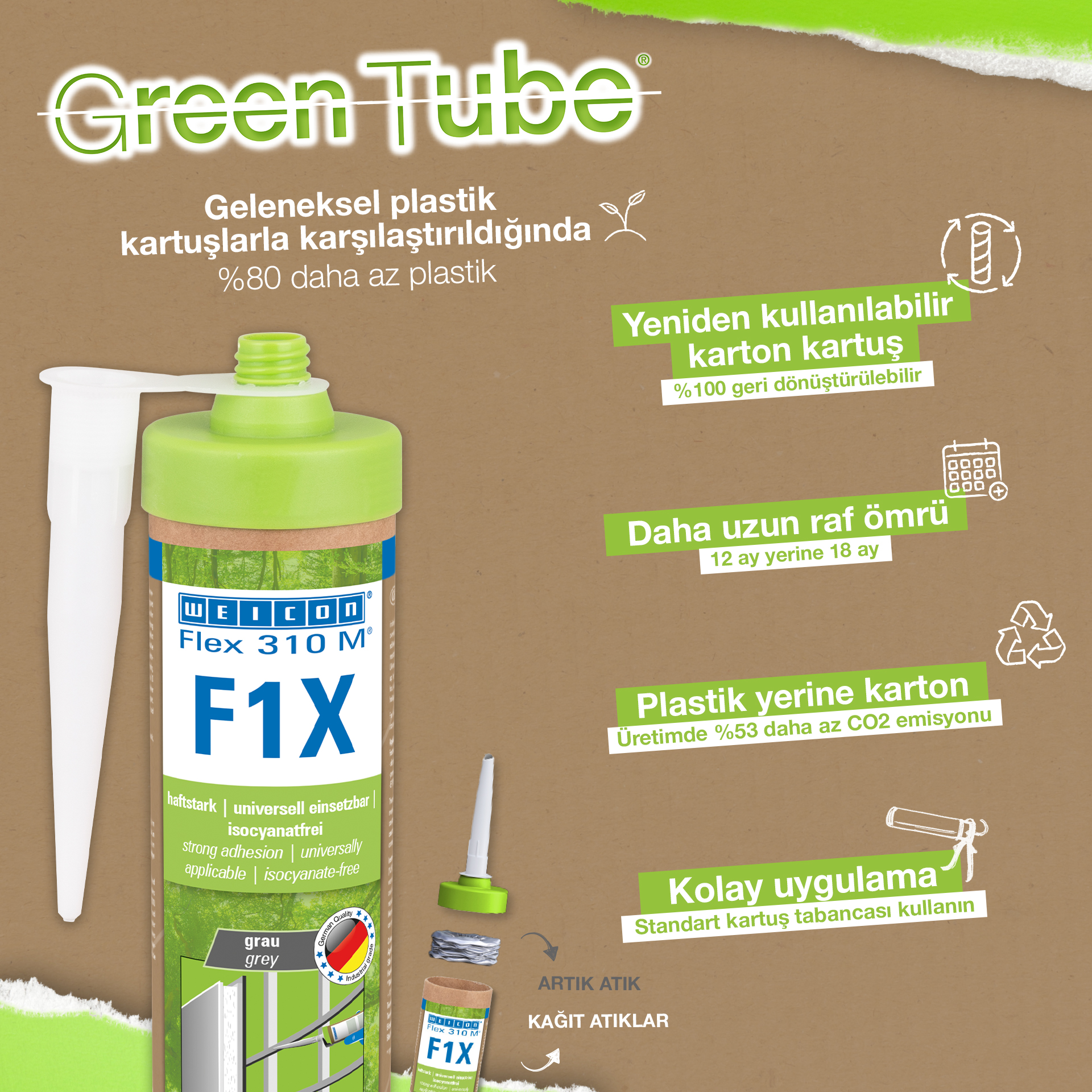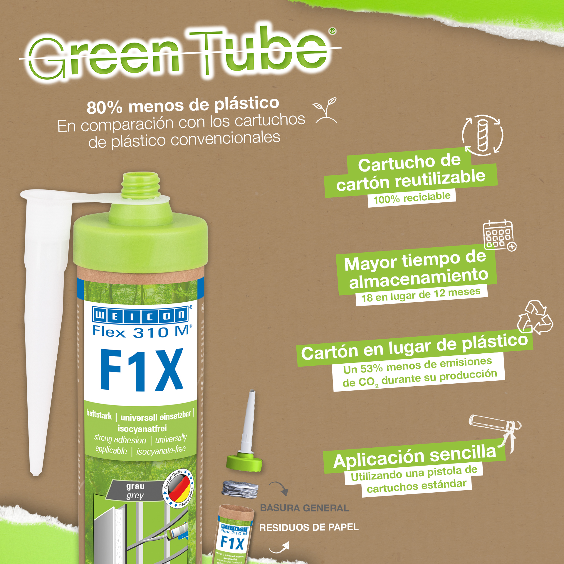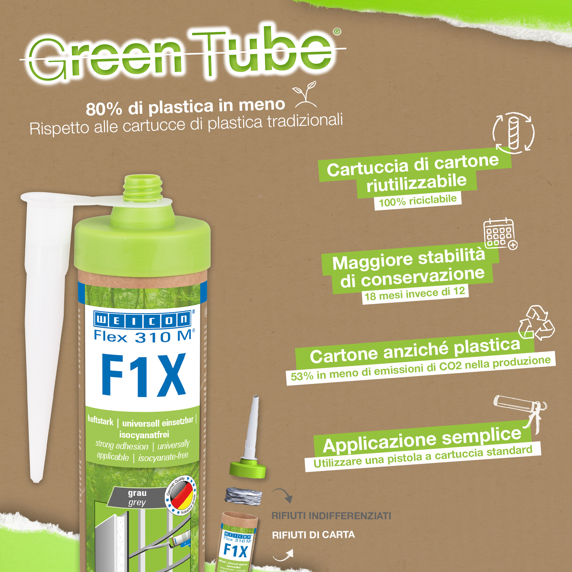 WEICON Flex 310 M F1X is een elastisch kleef- en afdichtmiddel op basis van MS-polymeren. De grijze lijm is zeer sterk en universeel geschikt voor het permanent bevestigen van bijna alle materialen op allerlei oppervlakken. Dankzij de zeer hoge aanvankelijke hechting is verlijming op verticale oppervlakken mogelijk en zelfs boven het hoofd, zowel binnen als buiten. Flex 310 M F1X kan bijvoorbeeld gebruikt worden om metalen, vele kunststoffen, keramiek, hout, glas en steen aan elkaar te lijmen. De permanent elastische lijm is "nat in nat" oververfbaar, schuurbaar, weersbestendig, vochtbestendig, verouderingsbestendig, schimmelbestendig en UV-bestendig. Het is gedurende korte tijd (tot 30 minuten) bestendig tegen temperaturen tot 180 °C en kan na een uithardingstijd van vier dagen gepoedercoat worden. De lijm en het afdichtingsmiddel bevatten geen siliconen, isocyanaat, halogeen en oplosmiddelen en zijn niet corrosief. Flex 310 M F1X kan voor het bevestigen van plinten, latten, strips, frames, panelen, platen, tegels, stenen en EPDM-folie gebruikt worden. Het kan gebruikt worden in gipsplaten en interieurbouw, in de metaalbouw, in de tank- en apparatenbouw, in de containerbouw, in ventilatie- en airconditioningtechnologie, in de beurs- en winkelbouw, in de jacht- en bootbouw en overal waar siliconen of producten die siliconen bevatten niet geschikt zijn. Duurzaam verpakt – En even sterk! Green Tube, de duurzame verpakking: de punt en het deksel bestaan 100% uit gerecycleerd kunststof, de patroon is 100 % volledig gemaakt uit karton. Minder CO2-uitstoot en plastic verbruik in vergelijking met conventionele patronen. Zonder enig voorbehoud op het gebied van prestaties!