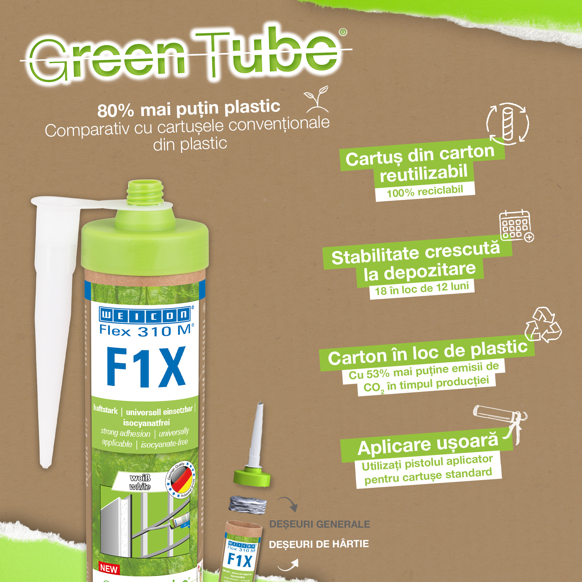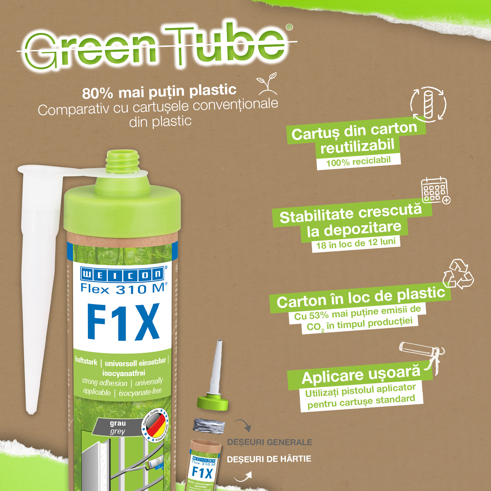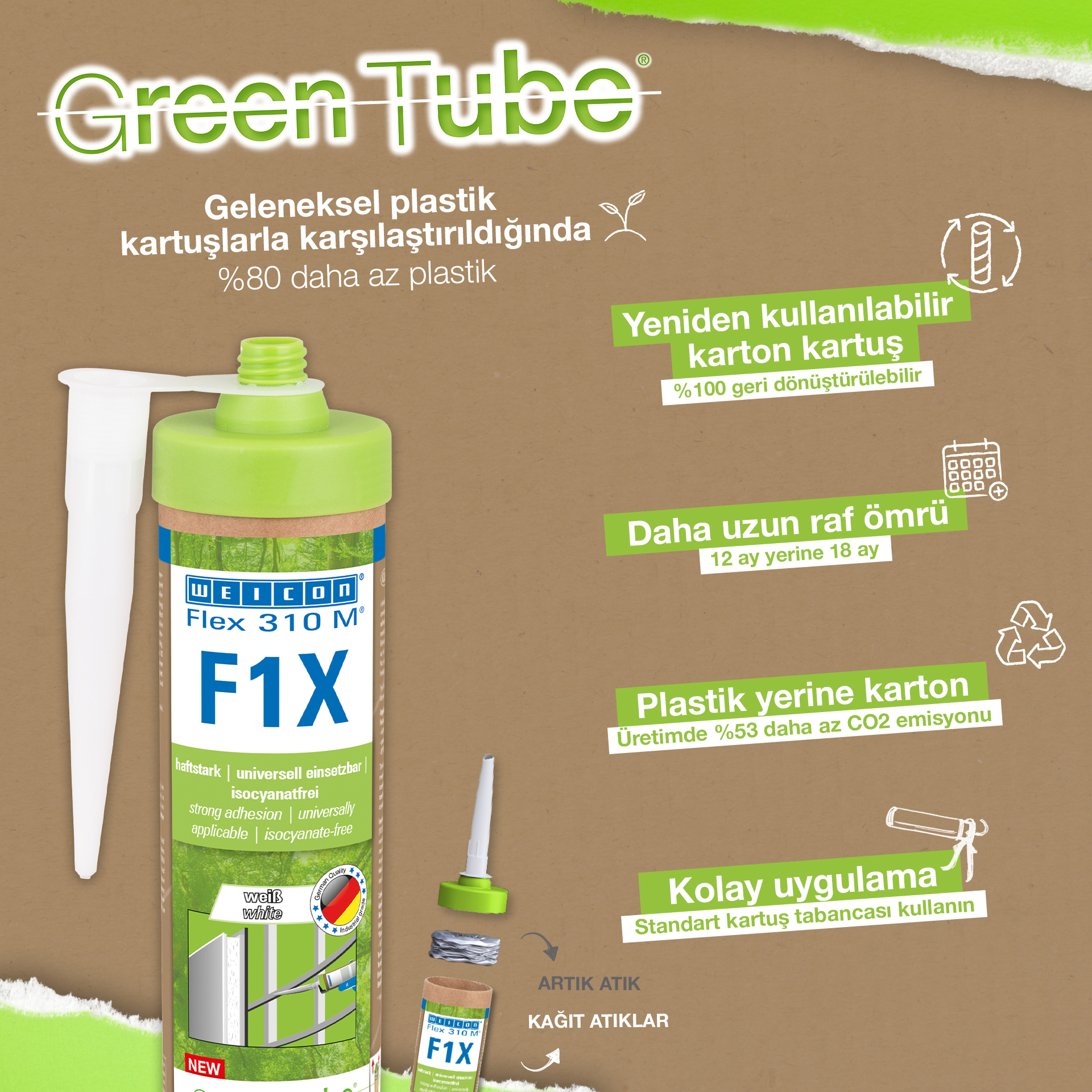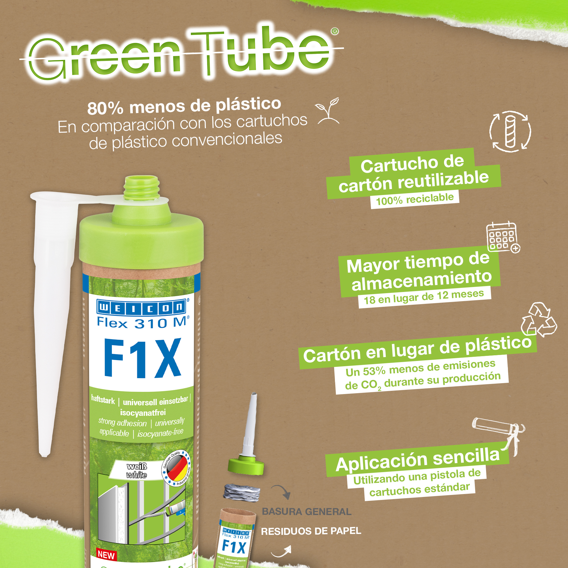 WEICON Flex 310 M F1X is een elastisch kleef- en afdichtmiddel op basis van MS-polymeren. De grijze lijm is zeer sterk en universeel geschikt voor het permanent bevestigen van bijna alle materialen op allerlei oppervlakken. Dankzij de zeer hoge aanvankelijke hechting is verlijming op verticale oppervlakken mogelijk en zelfs boven het hoofd, zowel binnen als buiten. Flex 310 M F1X kan bijvoorbeeld gebruikt worden om metalen, vele kunststoffen, keramiek, hout, glas en steen aan elkaar te lijmen. De permanent elastische lijm is "nat in nat" oververfbaar, schuurbaar, weersbestendig, vochtbestendig, verouderingsbestendig, schimmelbestendig en UV-bestendig. Het is gedurende korte tijd (tot 30 minuten) bestendig tegen temperaturen tot 180 °C en kan na een uithardingstijd van vier dagen gepoedercoat worden. De lijm en het afdichtingsmiddel bevatten geen siliconen, isocyanaat, halogeen en oplosmiddelen en zijn niet corrosief. Flex 310 M F1X kan voor het bevestigen van plinten, latten, strips, frames, panelen, platen, tegels, stenen en EPDM-folie gebruikt worden. Het kan gebruikt worden in gipsplaten en interieurbouw, in de metaalbouw, in de tank- en apparatenbouw, in de containerbouw, in ventilatie- en airconditioningtechnologie, in de beurs- en winkelbouw, in de jacht- en bootbouw en overal waar siliconen of producten die siliconen bevatten niet geschikt zijn. Duurzaam verpakt – En even sterk! Green Tube, de duurzame verpakking: de punt en het deksel bestaan 100% uit gerecycleerd kunststof, de patroon is 100 % volledig gemaakt uit karton. Minder CO2-uitstoot en plastic verbruik in vergelijking met conventionele patronen. Zonder enig voorbehoud op het gebied van prestaties!