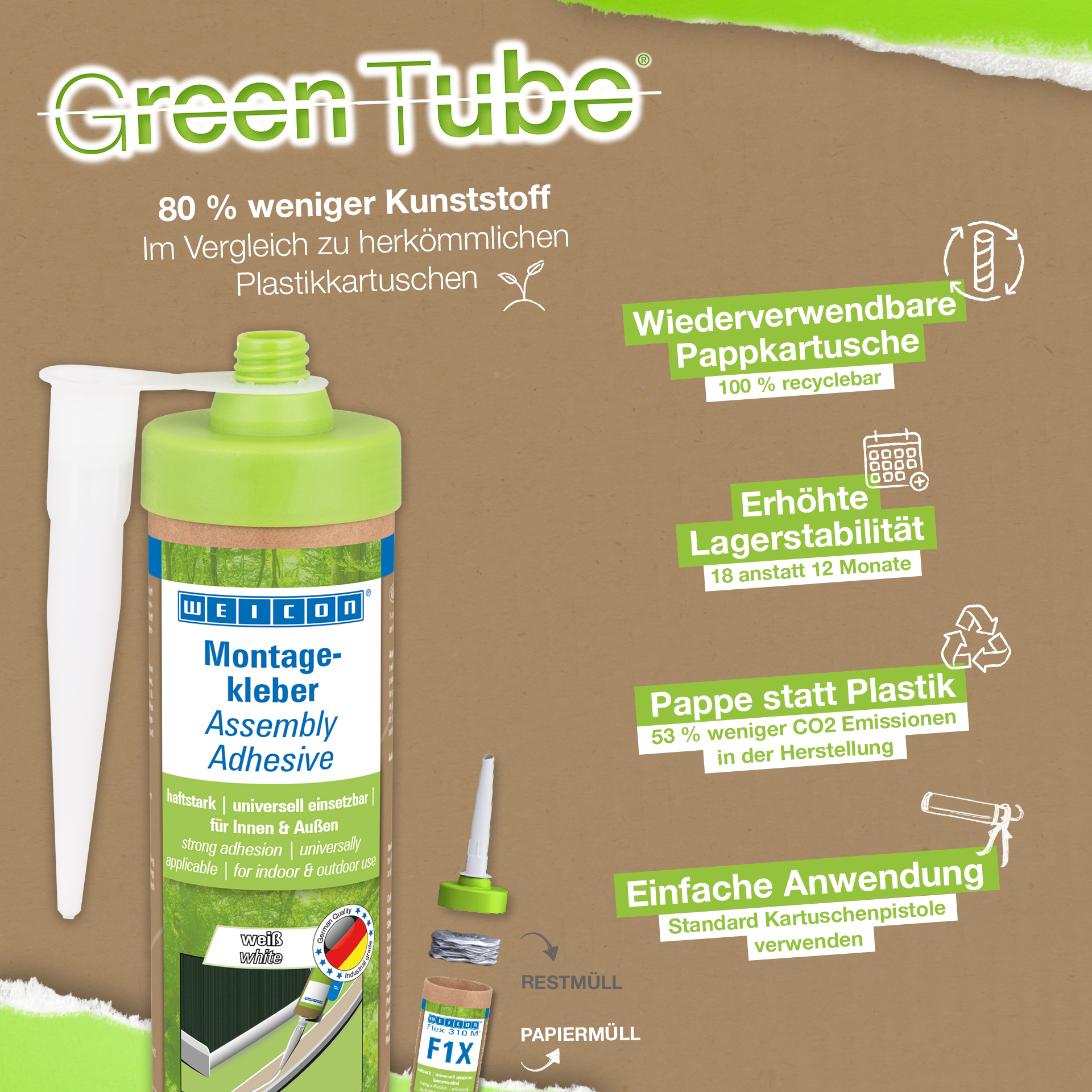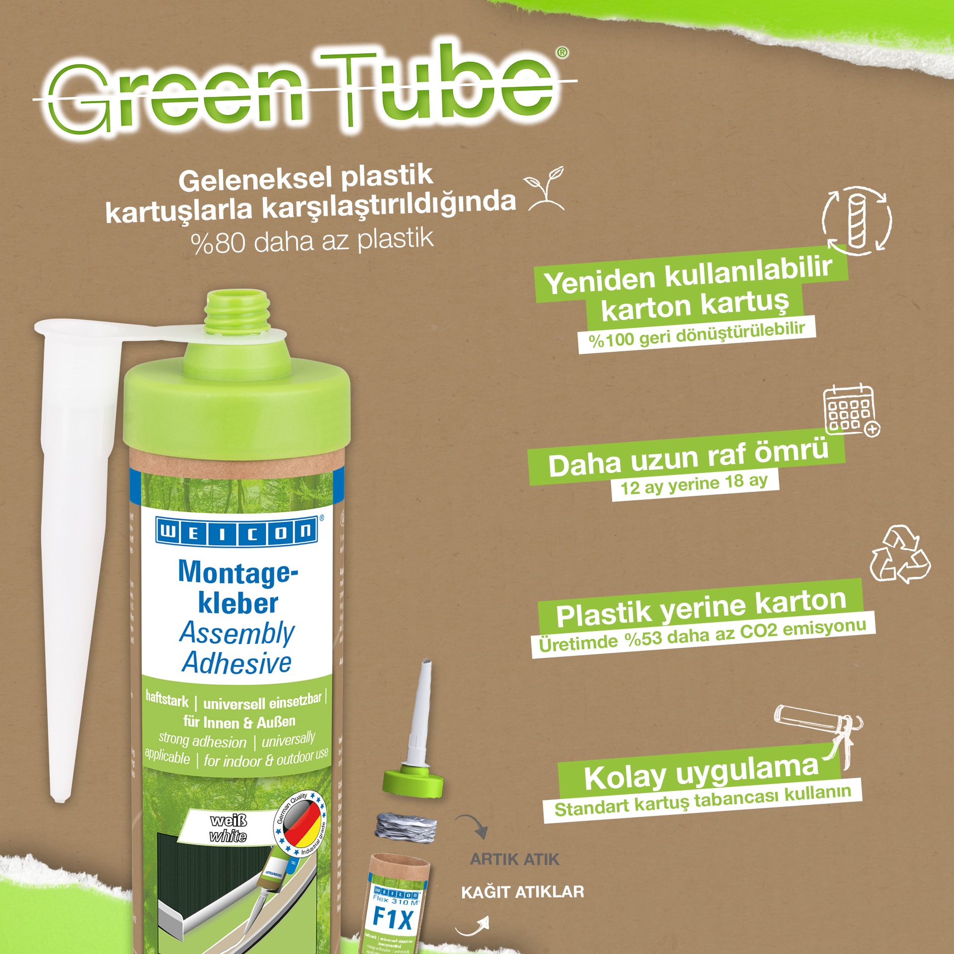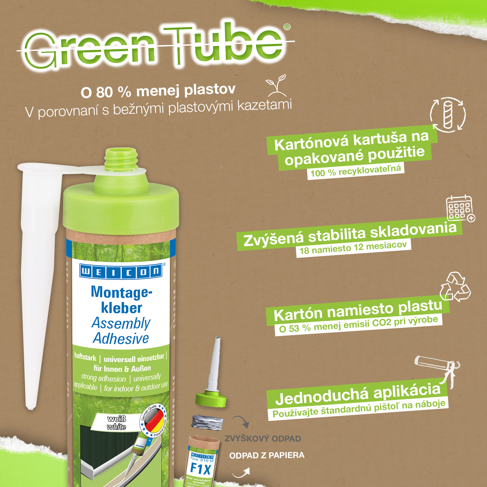 WEICON Montagelijm is een sterke dispersielijm op basis van acryl voor montage-, reparatie- en verbeteringswerkzaamheden. De lijm heeft een hoge aanvangshechting en eindsterkte en hardt snel uit. Na het drogen kan de montagelijm geschuurd en bepleisterd worden en kan hij overschilderd worden met in de handel verkrijgbare verven en vernissen. De lijm is temperatuurbestendig in een bereik van -20 °C tot +80 °C en is geschikt voor zowel binnen- als buitentoepassingen. De witte flexibele lijm is emissiearm en bevat geen oplosmiddelen. De montagelijm is universeel toepasbaar en kan voor veel verschillende toepassingen gebruikt worden. Het is bijvoorbeeld ideaal voor oppervlakteverlijming van materialen op houtbasis (zoals plinten, decoratieve strips, panelen of spaanplaat), PVC, polystyreen, polystyreenschuimplaten, PU-hardschuim (bijv. isolatieplaten en kabelgoten), minerale materialen (bijv. tegels) en metalen op zuigende ondergronden zoals pleisterwerk, beton, vezelcement, gipsplaat en onbehandeld hout. Duurzaam verpakt – En even sterk! Green Tube, de duurzame verpakking: de punt en het deksel bestaan 100% uit gerecycleerd kunststof, de patroon is 100 % volledig gemaakt uit karton. Minder CO2-uitstoot en plastic verbruik in vergelijking met conventionele patronen. Zonder enig voorbehoud op het gebied van prestaties!